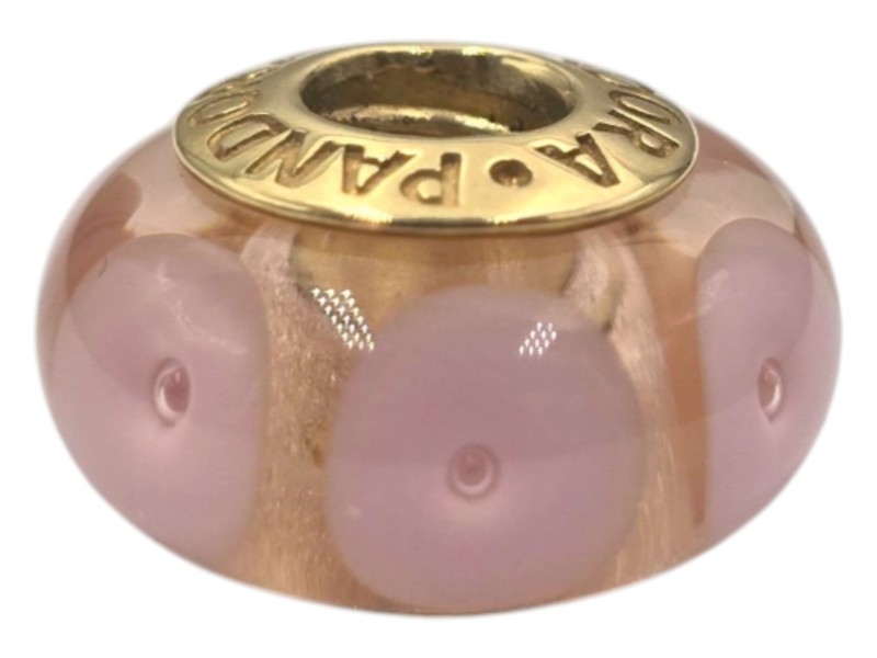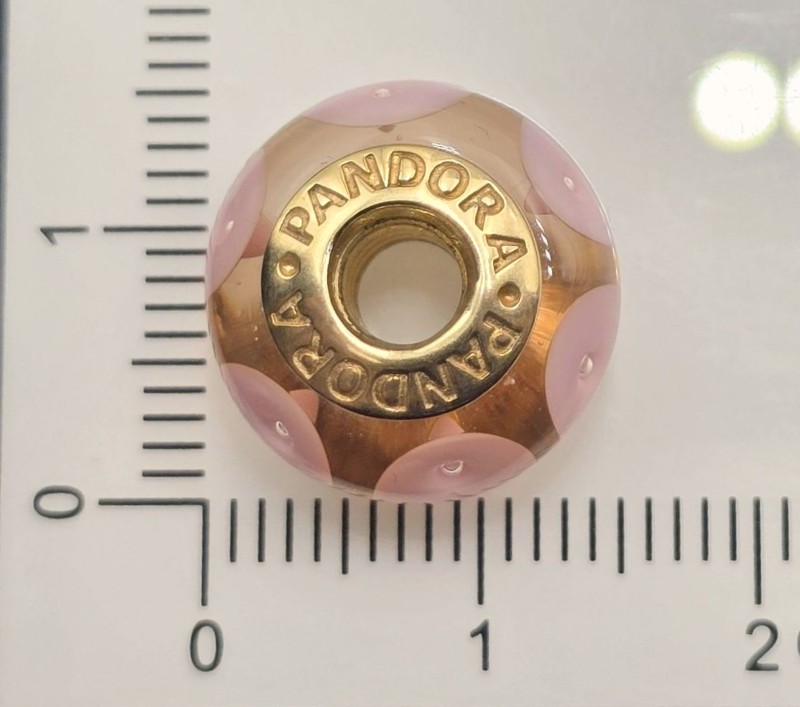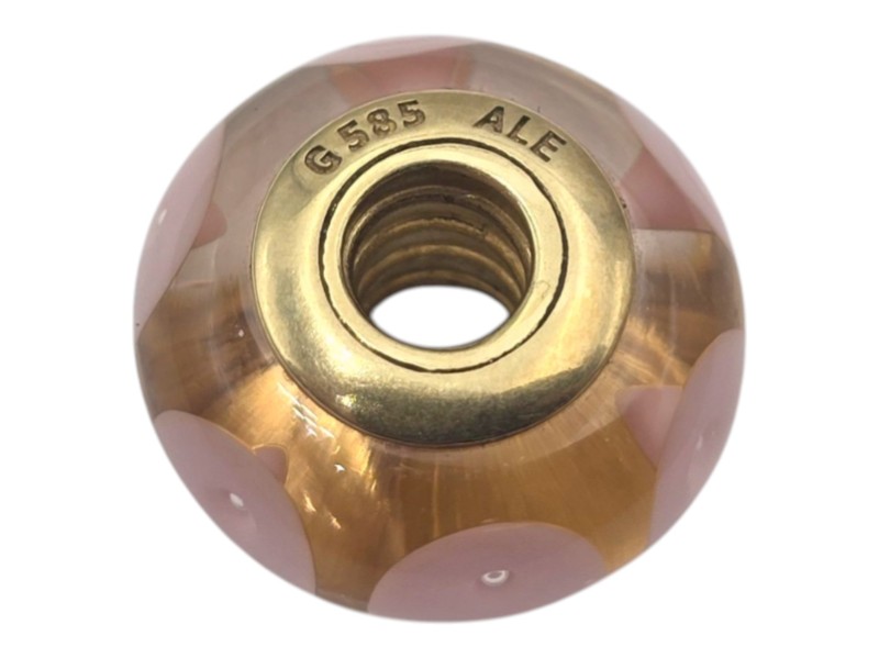 This 14k yellow gold Pandora charm features a delicate pink hue. The 585 ALE engraving and .585 hallmark confirm its 14k composition. Weighing a modest 3.83g, this charm is a charming accessory suitable for ladies. All sizes and measurements are approximate.