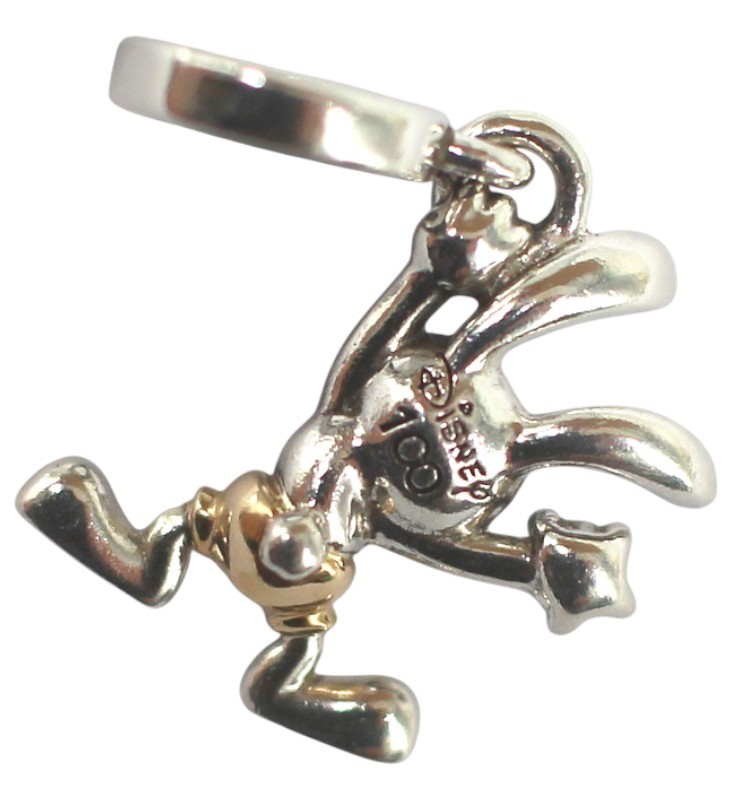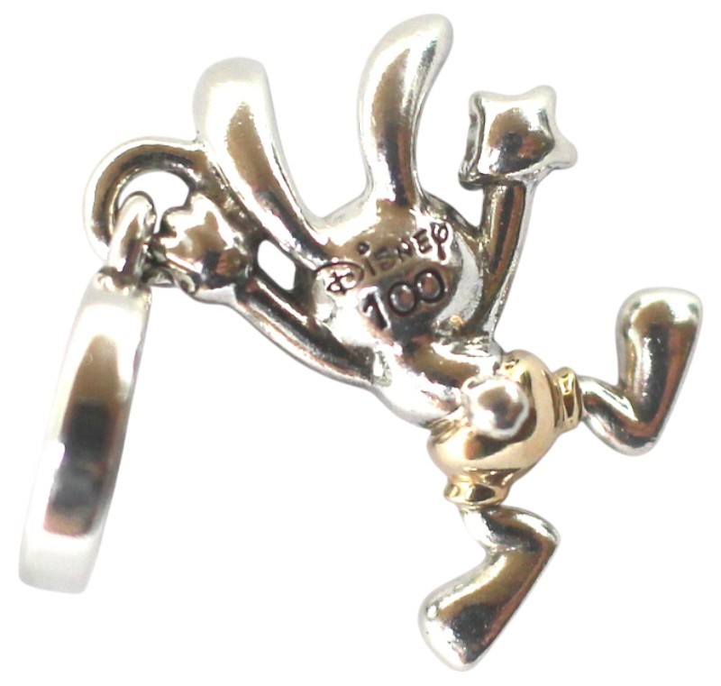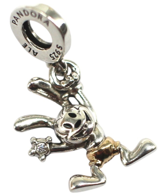 Celebrate one of the Disney's original characters. Oswald is hand-finished in sterling silver with hand-applied black enamel eyes and 14k gold trousers. He is playfully holding a sparkling lab-grown diamond in one hand and swinging from the bail with the other. To commemorate 100 years of magic, "Disney 100" is engraved on the back of his head. Wear this limited edition charm as a reminder to reach for your dreams - just like Oswald. Each Lab-grown diamond is treated with a post-growth colour enhancement called annealing. Engraving Details: DISNEY 100 PANDORA S925 ALE.