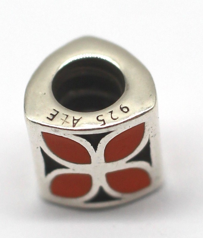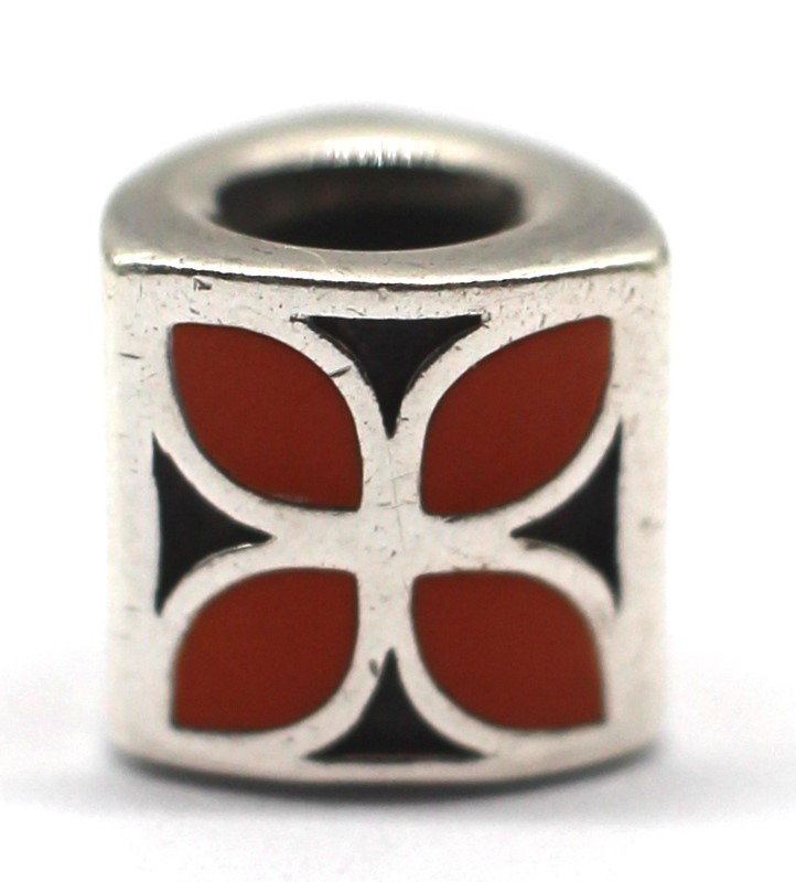 This sterling bead is triangle-shaped with curving edges, and has an orange enamel flower design on each surface. The bright colours can greatly enhance your bracelet and can pair easily with our numerous patterned silver beads.