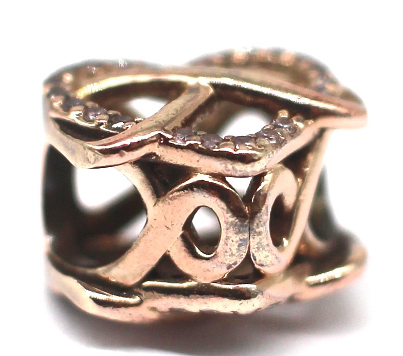 Say "love you forever" with 14k rose gold plating and sparkling stones. Our openwork charm features an infinity symbol wrapping an open heart to symbolize everlasting love that binds families together. A constellation of brilliant-cut, pink cubic zirconia decorates the heart outline and adds a pop of color. Style this charm on your bracelet and carry reminders of your loved ones wherever you go.