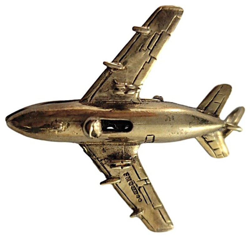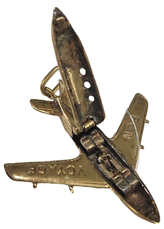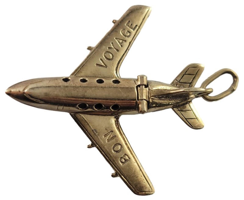 This 9 karat yellow gold pendant features a stylish mini jet plane design featuring the inscription 'Bon Voyage' on its wings. It also has a fastening clip that allows the top of the fuselage to flip up revealing two passengers.