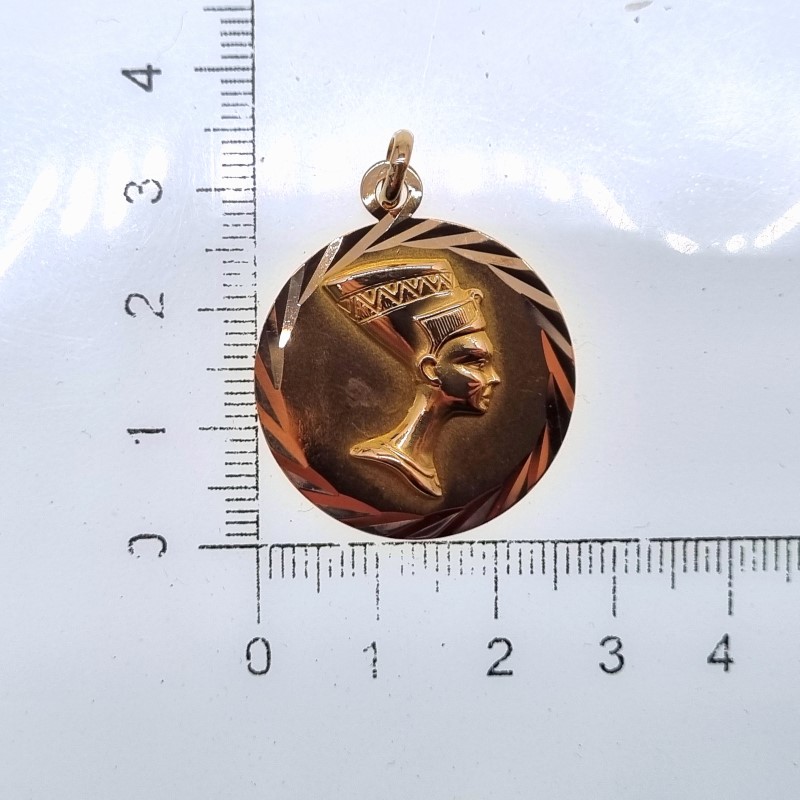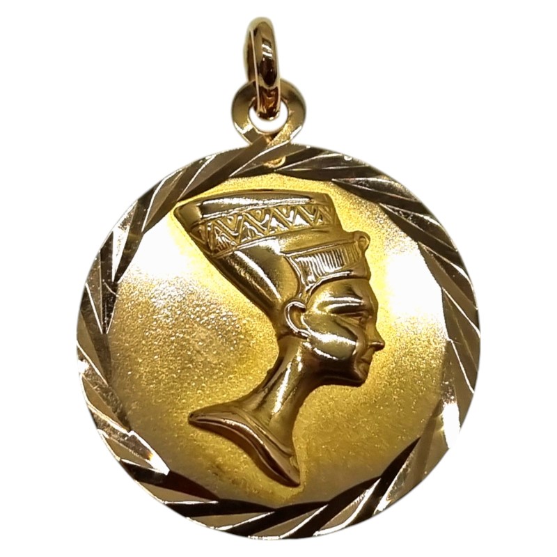 This exquisite 18-karat gold pendant features a captivating profile of the iconic Egyptian Queen Nefertiti, set against a beautifully textured background. The pendant's timeless design and high-quality gold make it a perfect piece for any jewelry collection.