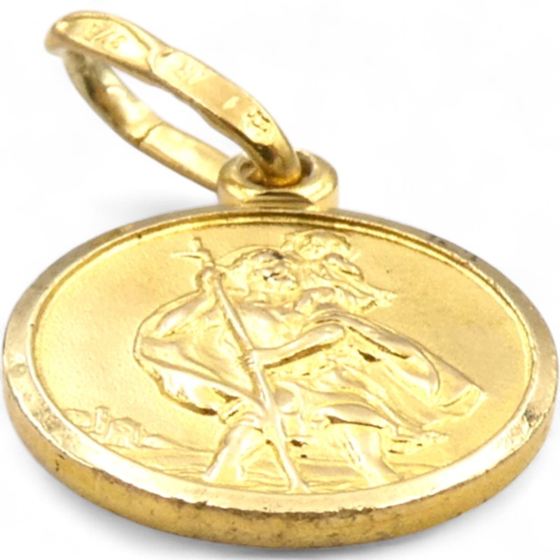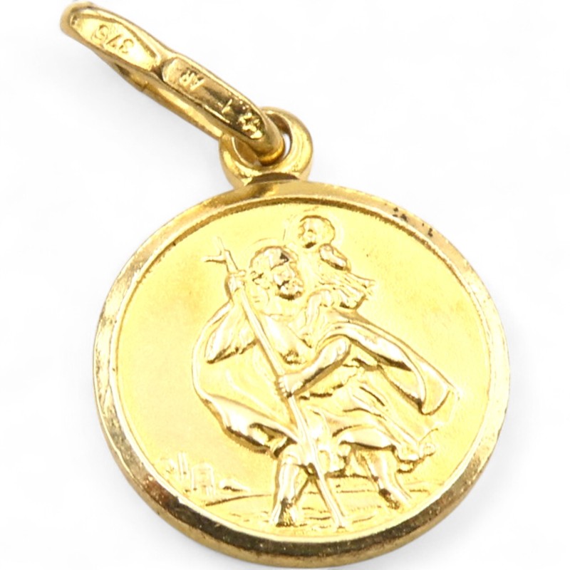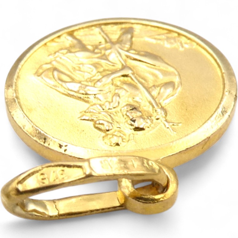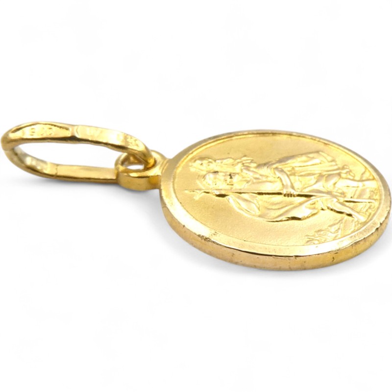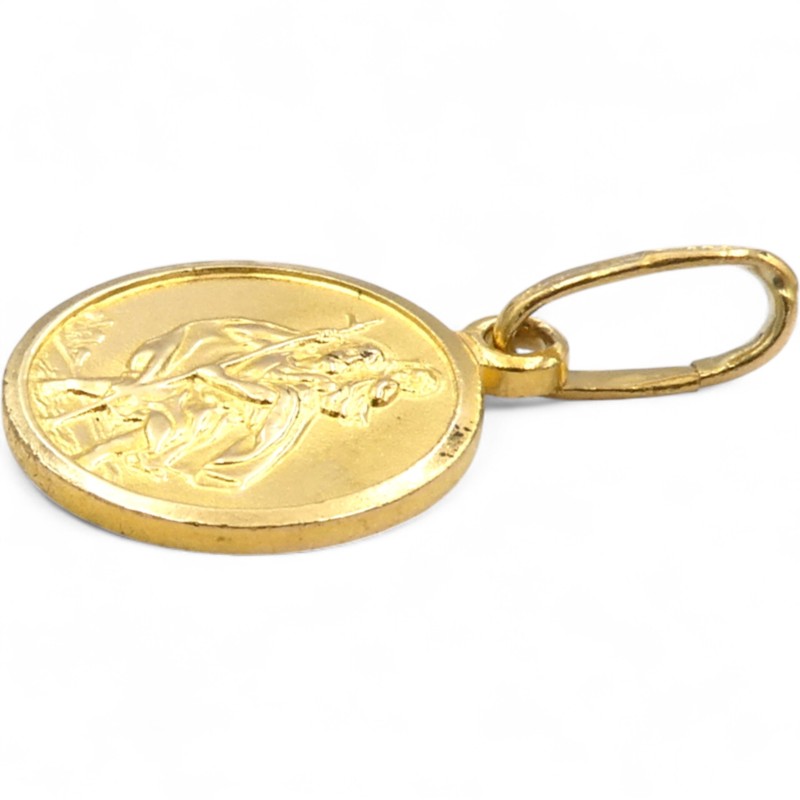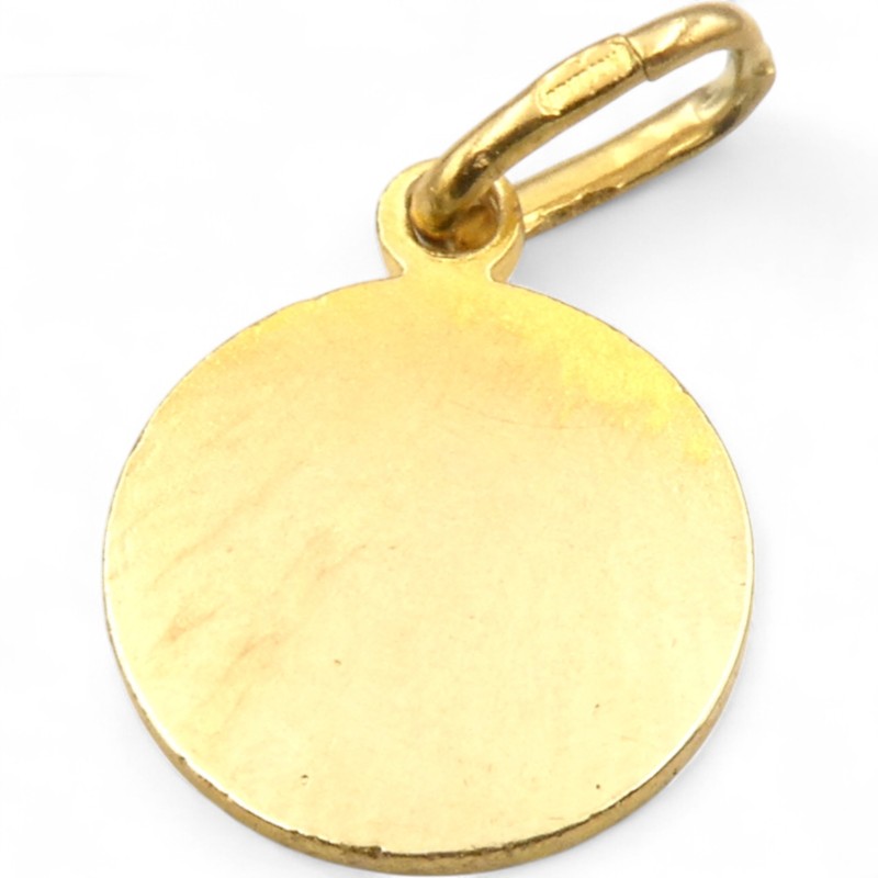 This 9K yellow gold pendant features a circular shape and weighs 0.83 grams. The pendant is hallmarked .375, indicating 9 karat gold. The engraved text "1 AR 375" adds a religious element to this unisex accessory, which measures 1.6 cm in length and 1 cm in width. All sizes and measurements are approximate.