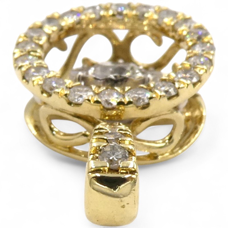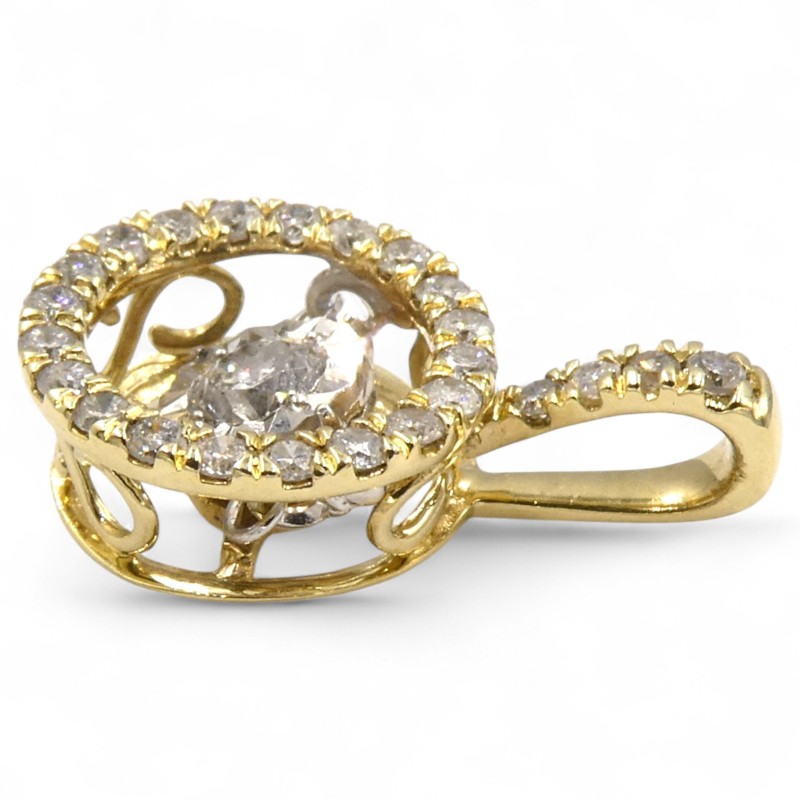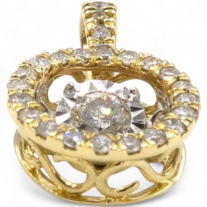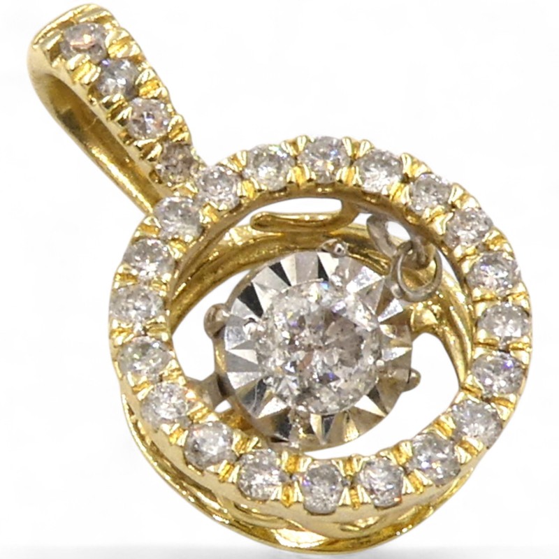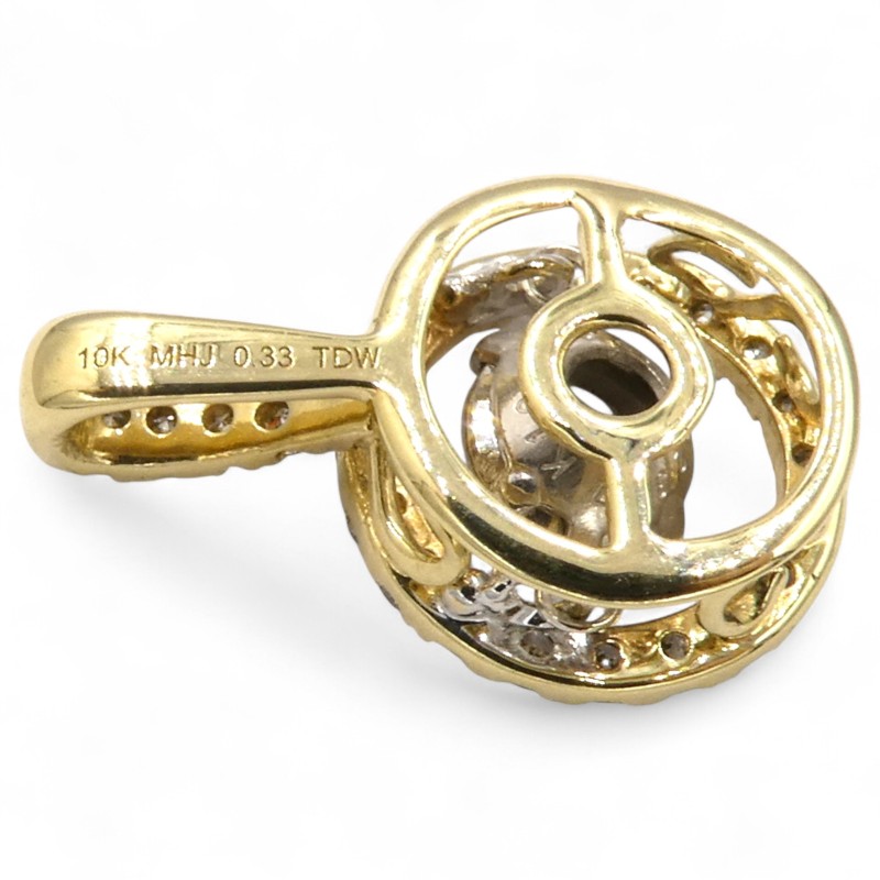 This 10k yellow gold pendant features a 0.12ct H-colour diamond centre stone with a round brilliant cut. The pendant is adorned with 20 accent diamonds totalling 0.01ct, as well as a 0.01ct and three 0.007ct diamonds, for a total diamond weight of 0.351ct. Engraved with '10k MHJ 0.33 TDW', this ladies' pendant measures 16cm long and weighs 1g. All sizes and measurements are approximate.