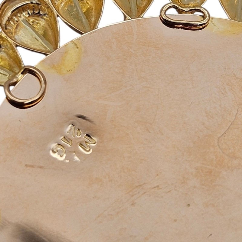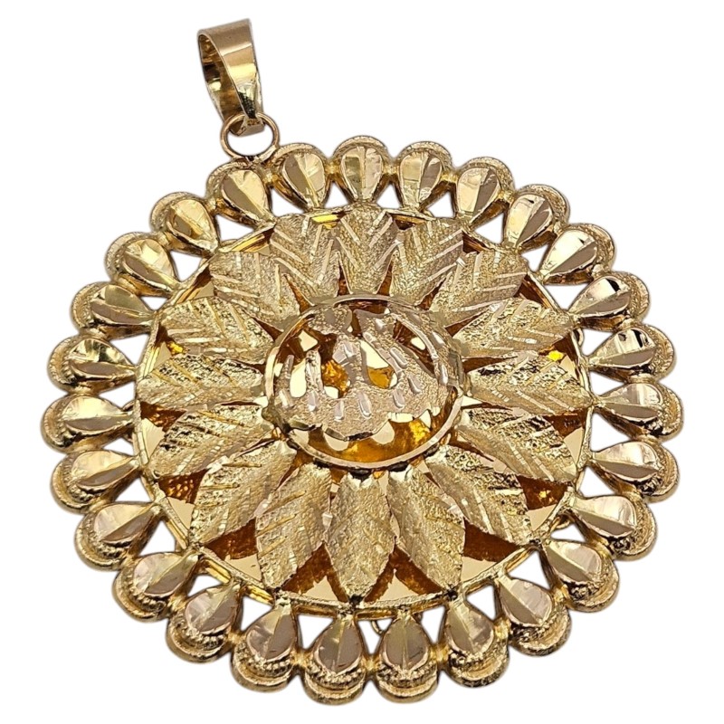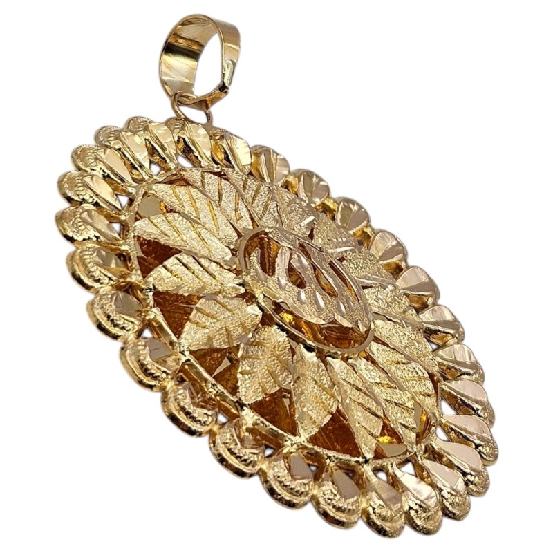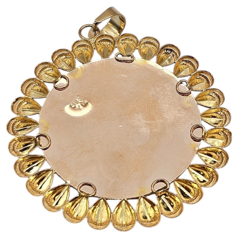This striking 21 karat yellow gold pendant features a decorative circular design. Measuring 7.5 cm in length and weighing 14 grams, this unisex accessory is detailed with the engraved letters 'MA 21C'. Crafted from high-quality yellow gold, this versatile pendant can be worn as a stylish accent piece for any occasion. All sizes and measurements are approximate.