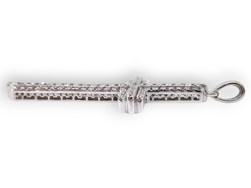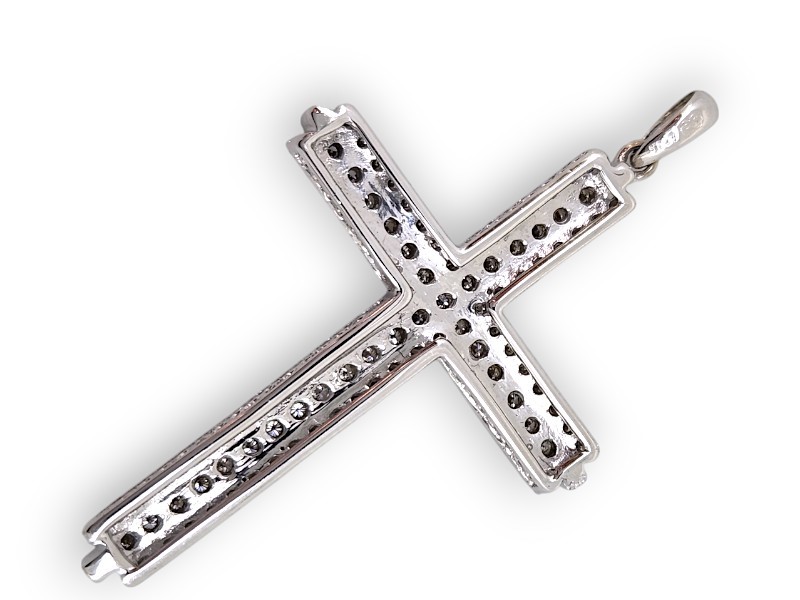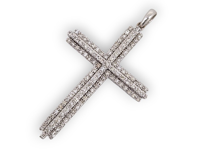 Express your faith in style with this beautiful 9ct white gold cross pendant, now at a great price! It's bead-set with three rows of ninety-six sparkling round brilliant diamonds, totalling 0.96ct (clarity SI-P2, colour J-L ). Measuring 48mm x 28mm, it has a movable bale, making it easy to pair with your favourite chain. Valued at $3,335, this pendant was initially priced at $2,295.