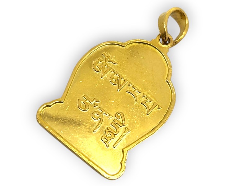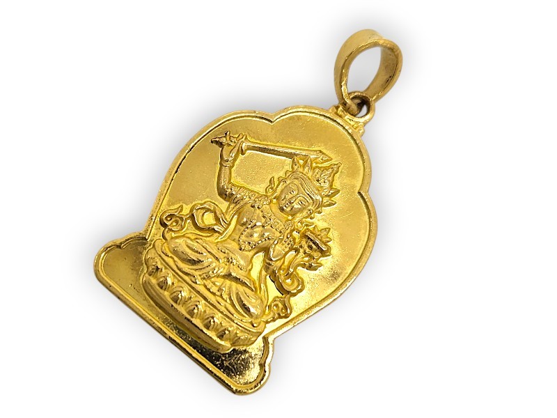 24K yellow gold Manjushri pendant. This exquisite piece features a classic pendant design crafted from premium 24-karat gold. Measuring 3.7cm in length and 2cm wide, the pendant weighs a substantial 11.85g, ensuring a quality feel and finish. The .999 hallmark attests to the exceptional purity of the gold used in its construction. An elegant and timeless accessory, perfect for adding a touch of luxury to any outfit. All sizes and measurements are approximate.