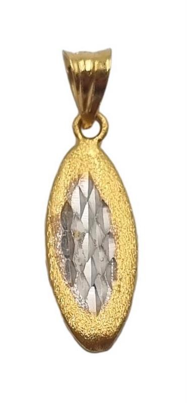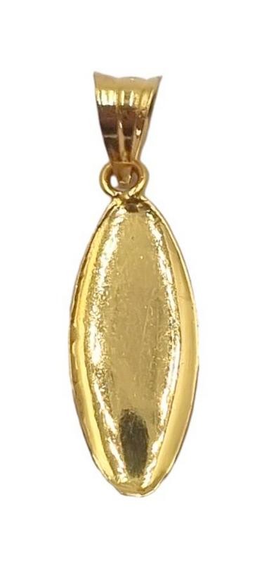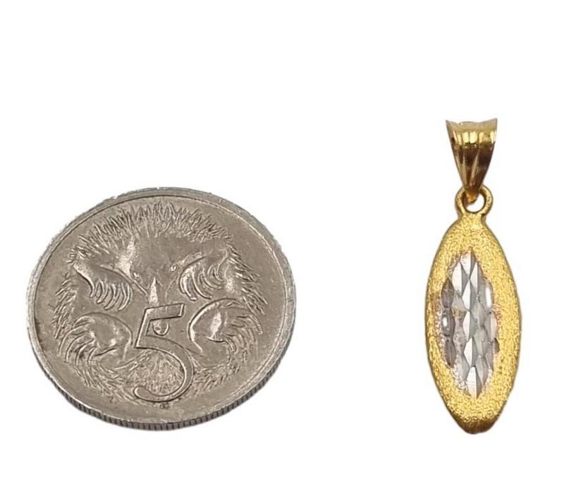 This stunning 22ct yellow gold pendant features a flat, oval shape with a hallmark of .916. Weighing a substantial 0.7 grams, this pendant measures 2cm in length and width. The warm hue of the 22 karat gold creates a classic, refined look that is both timeless and versatile. Whether worn alone or layered with other pieces, this pendant is a elegant addition to any jewellery collection. All sizes and measurements are approximate.