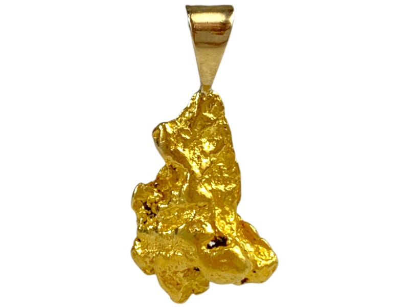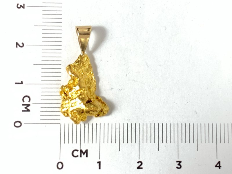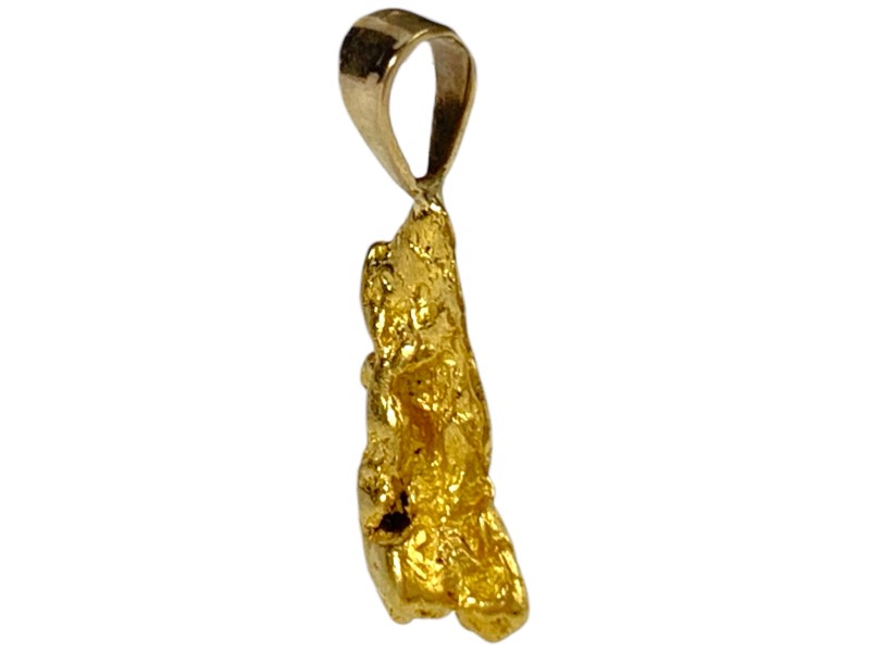 This striking 23.68ct yellow gold nugget pendant showcases the natural beauty of the metal. Weighing a substantial 4.0g, the pendant features a unique organic shape that is complemented by a 9ct yellow gold clasp. Measuring 2.5cm in length, this unisex piece is crafted with a hallmark of .375, ensuring quality and authenticity. All sizes and measurements are approximate.