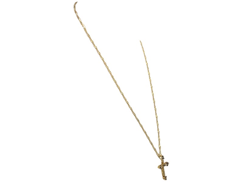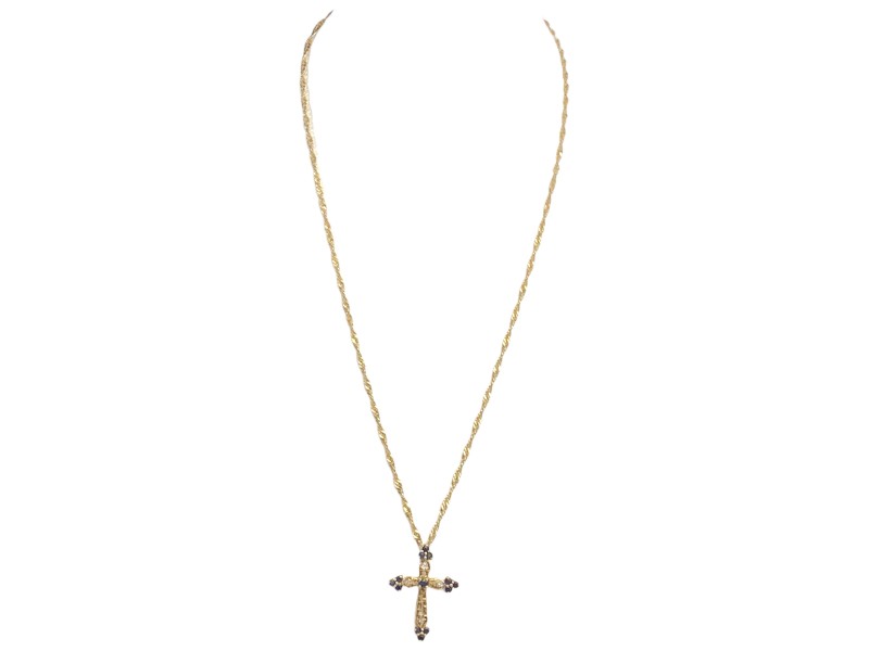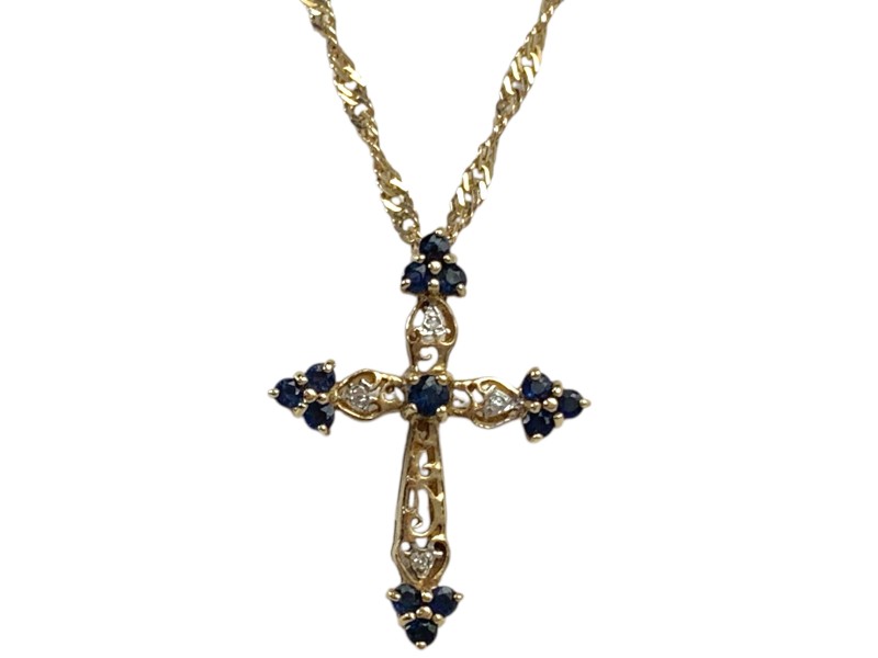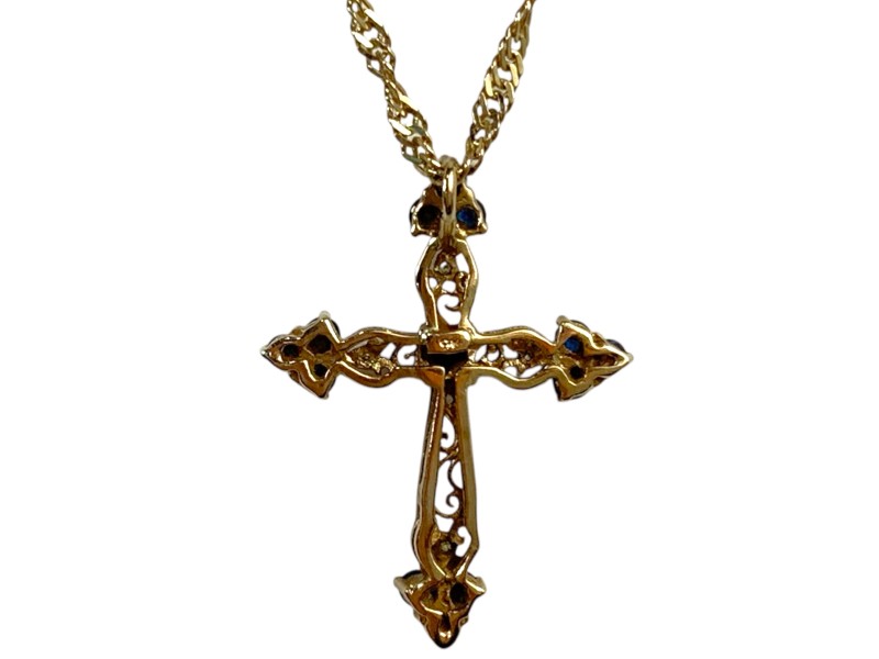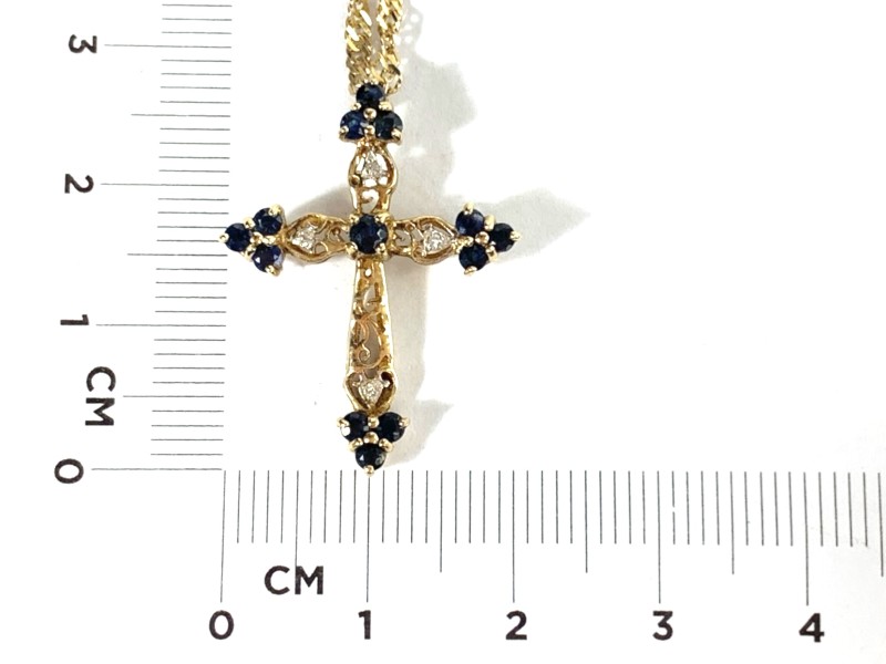 Description: 9CT YELLOW GOLD CROSS WITH DARK BLUS STONES ON CHAIN