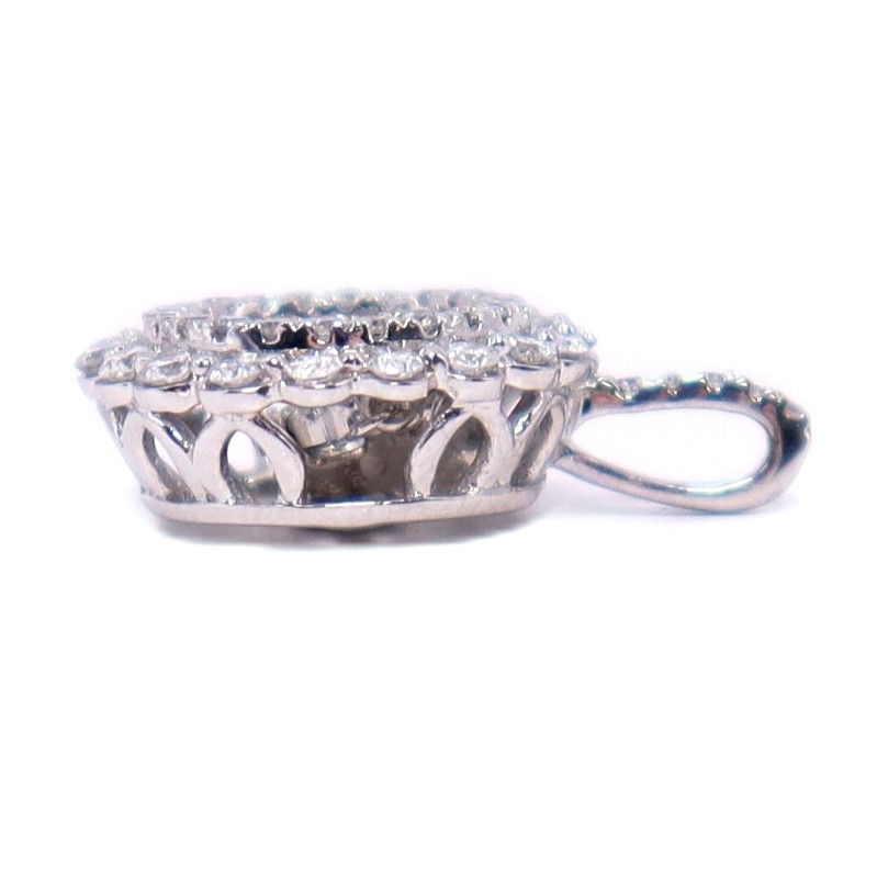 Crafted in 10K white gold, this stunning piece features a 0.33ct, H-colour, I2 clarity, round brilliant-cut diamond as the hero stone. Complementing the centre diamond are 18 diamonds totaling 0.015CT and 27 diamonds totaling 0.006CT, all set in a snowflake-inspired design. The pendant measures 1.9cm in length and 1.3cm in width, weighing 1.83 grams. All sizes and measurements are approximate.