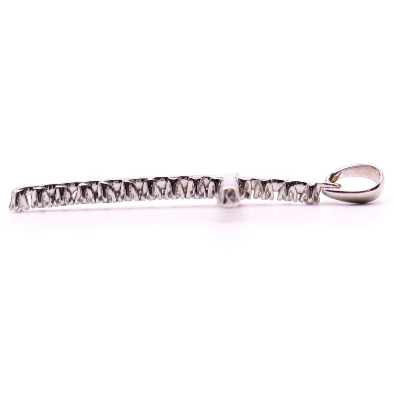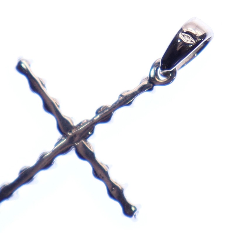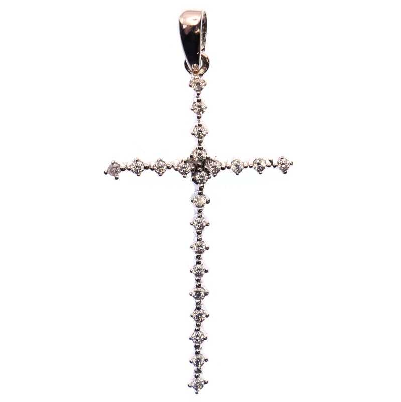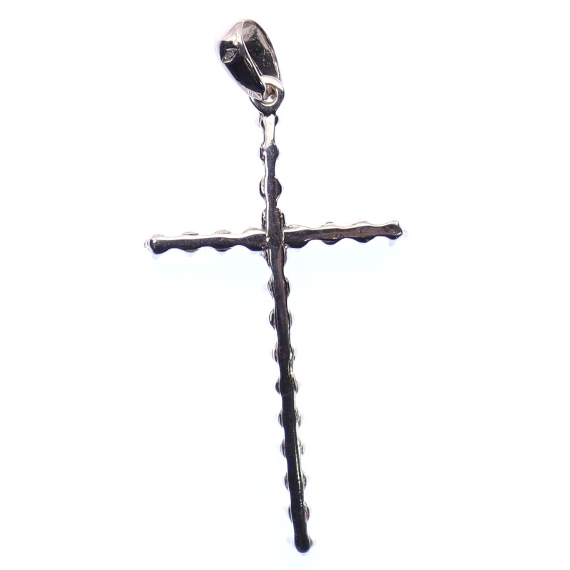 This 14 karat white gold cross pendant features a delicate design with 22 diamonds weighing a total of 0.33 carats. The stones are set in a claw setting, adding a touch of elegance. The pendant measures 4.1 cm in length and 2 cm in width, with a total weight of 1.89 grams. Hallmarked at .585, this versatile piece is perfect for everyday wear or special occasions. All sizes and measurements are approximate.