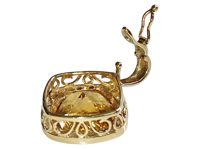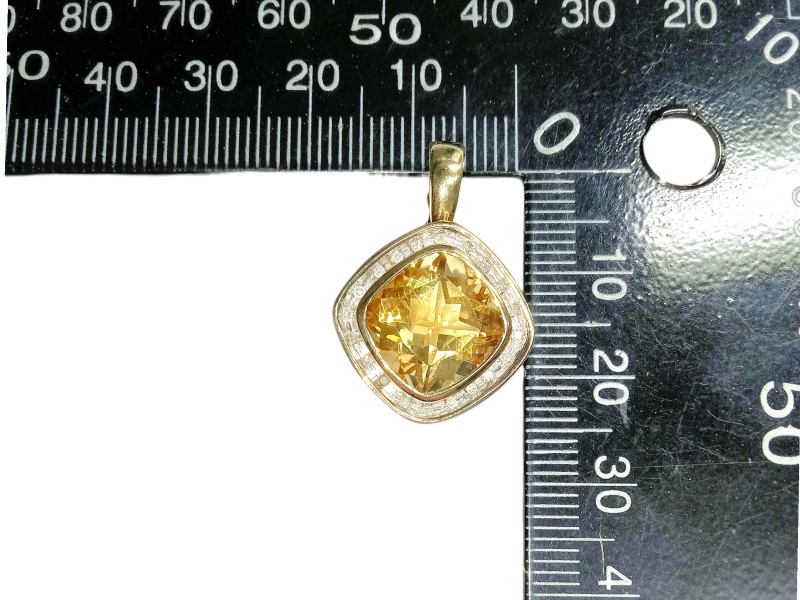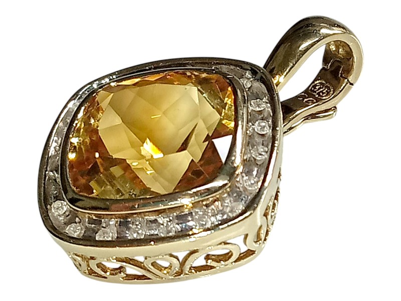 This stunning 9 karat yellow gold pendant features a vibrant yellow stone weighing 5 carats, accompanied by a sparkling cluster of 20 clear stones totaling 0.1 carats. The pendant measures 2.5cm in length and 1.8cm in width, with a total weight of 3.79 grams. The piece is hallmarked 375 cg, indicating its quality. This versatile ladies' enhancer pendant is the perfect addition to any jewellery collection. All sizes and measurements are approximate.