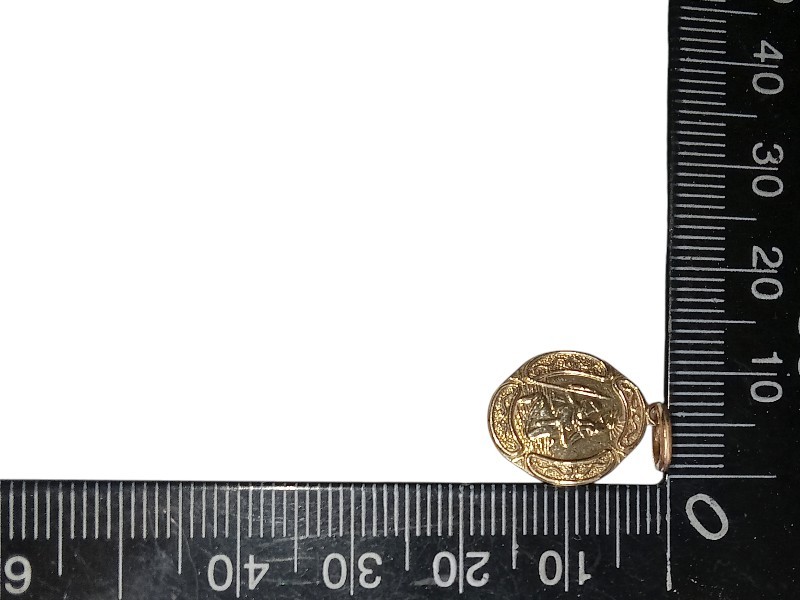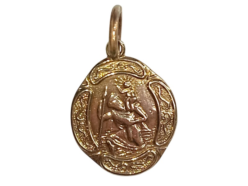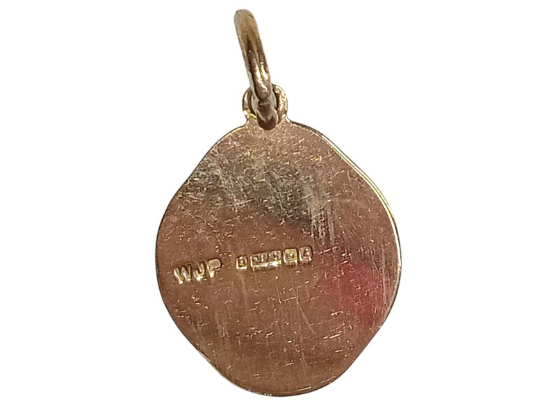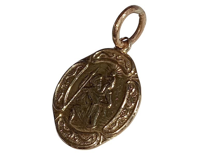 This elegant yellow gold pendant features a St Christopher design with the engraved initials "WJP 9". Crafted from 9 carat yellow gold, the pendant measures 1.7 cm in length and 1.2 cm in width, weighing a total of 1.16 grams. The unique shape adds a modern touch to this timeless religious symbol. All sizes and measurements are approximate.