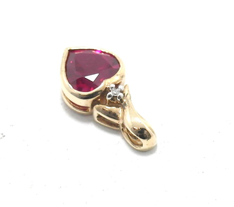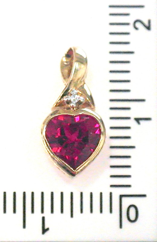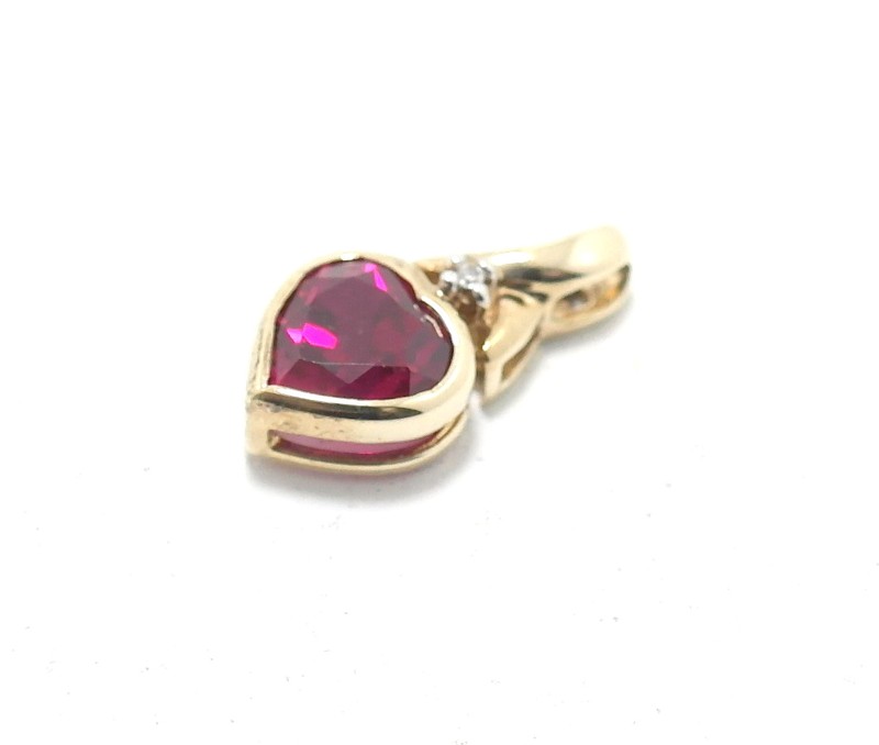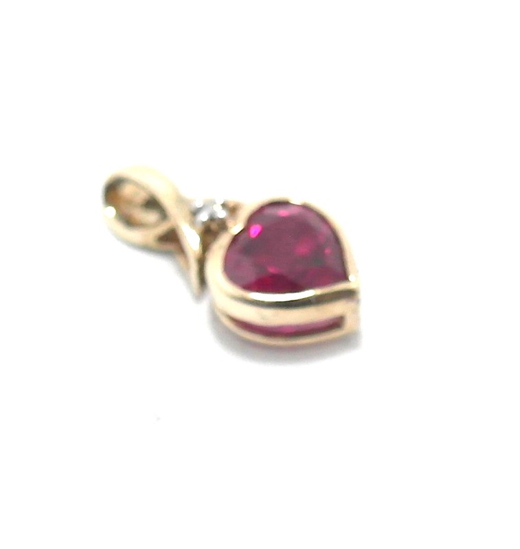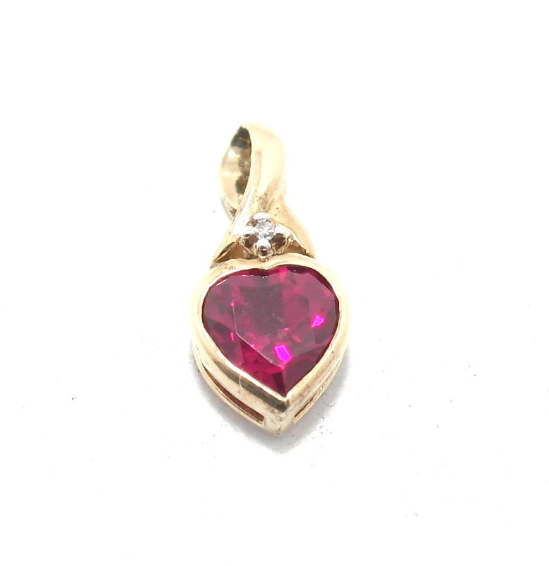 This stunning 9ct yellow gold pendant features a heart-shaped design with a single red gemstone. The pendant's hallmark of .375 (9kt) confirms its quality craftsmanship. Weighing 0.76 grams, this Ladies' pendant showcases elegant engraving details of '375 CR GM 24'. A versatile addition to any jewellery collection, this pendant can be worn on its own or paired with a complementary chain. All sizes and measurements are approximate.