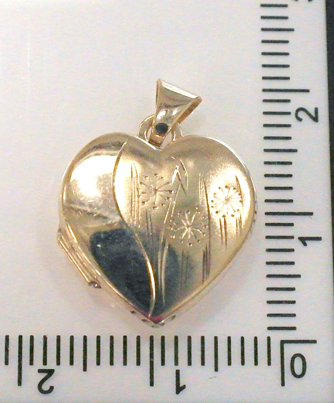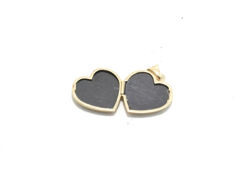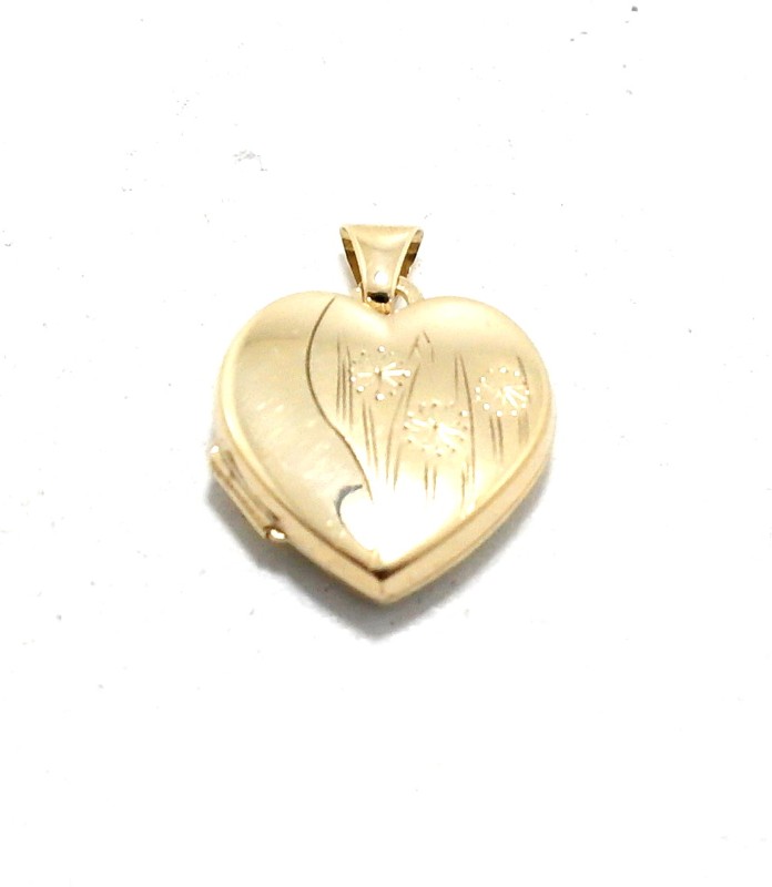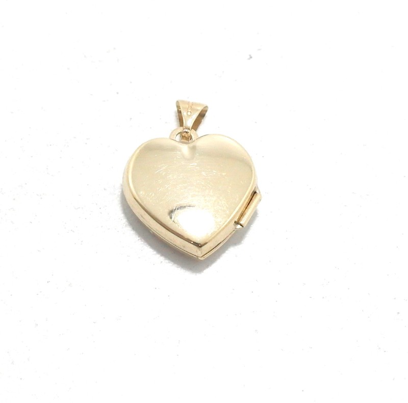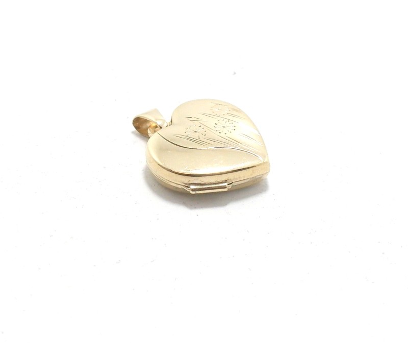 This 9 Karat yellow gold locket pendant features a heart-shaped main pendant. The locket is engraved with the hallmark '375', indicating it is 9 Karat gold. Measuring 1.8 cm in length and 1.5 cm in width, the pendant weighs a total of 1.02 grams. All sizes and measurements are approximate.