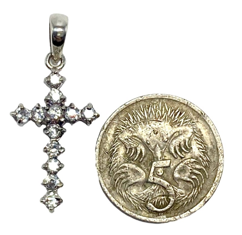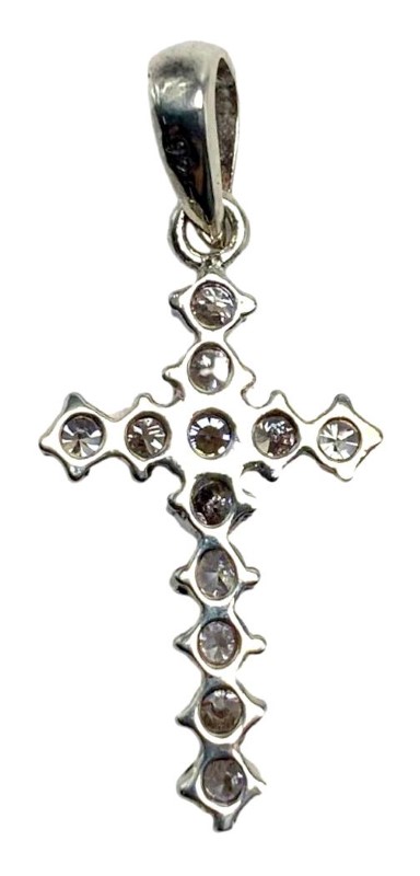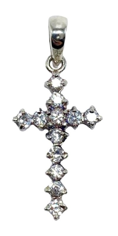 Sterling sliver cross pendant claw-set with cubic zirconia.