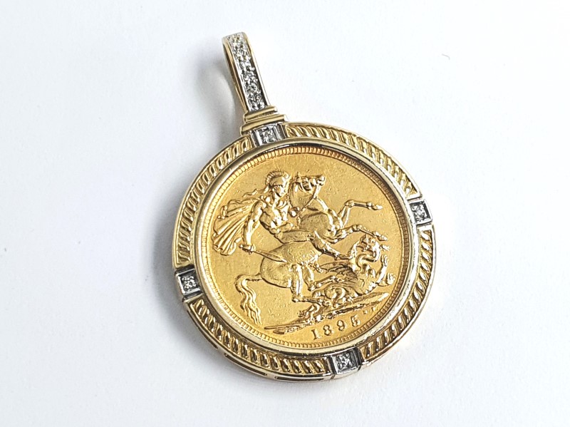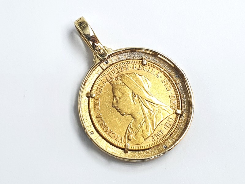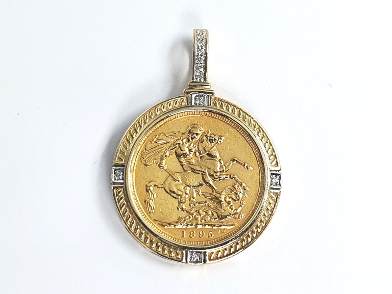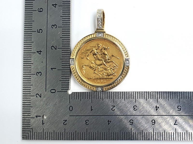Full sovereign 22ct coin 7.98g - Casing 9ct 3.27g - Surrounded by Diamonds