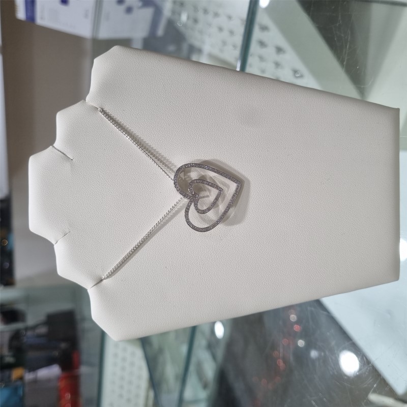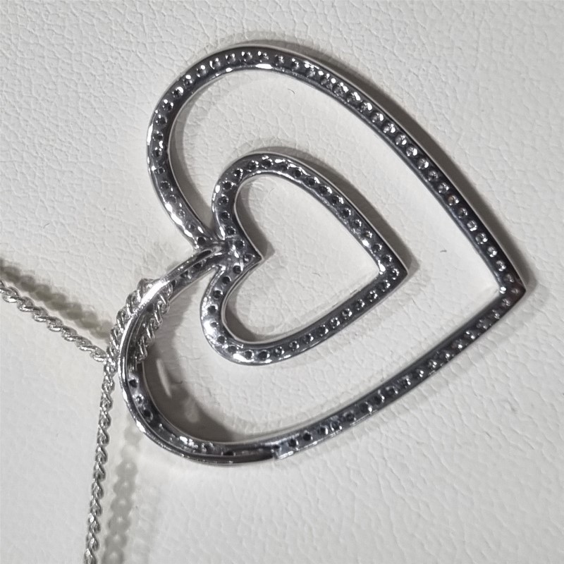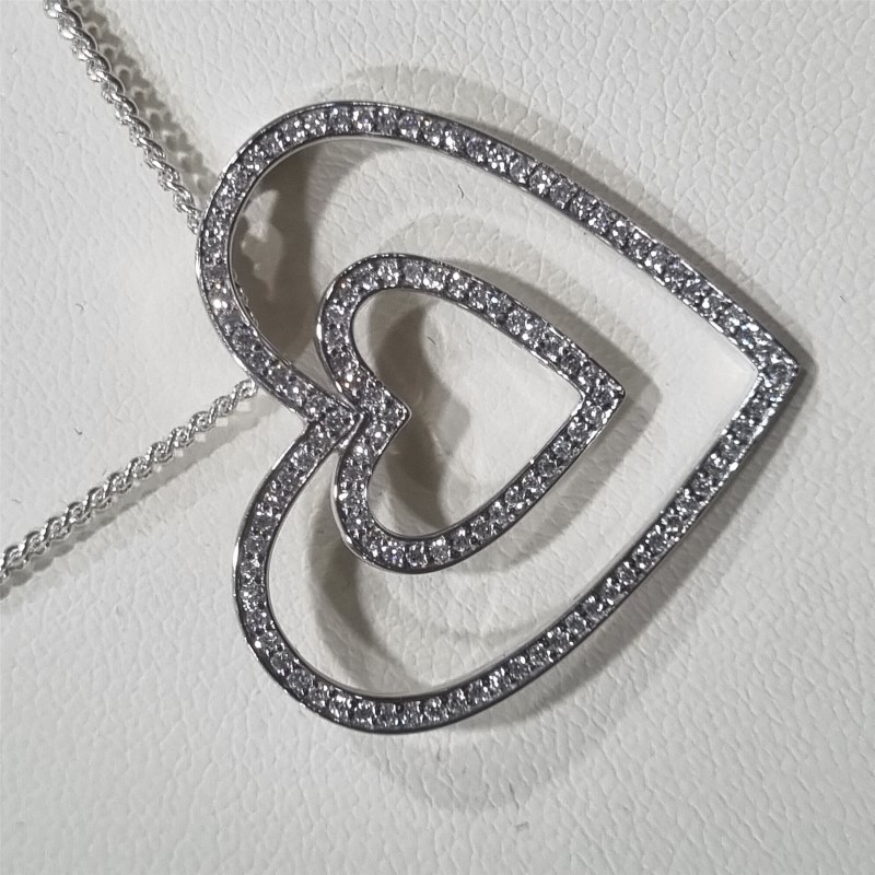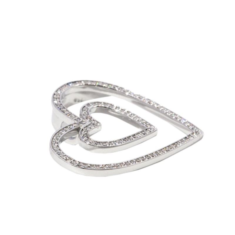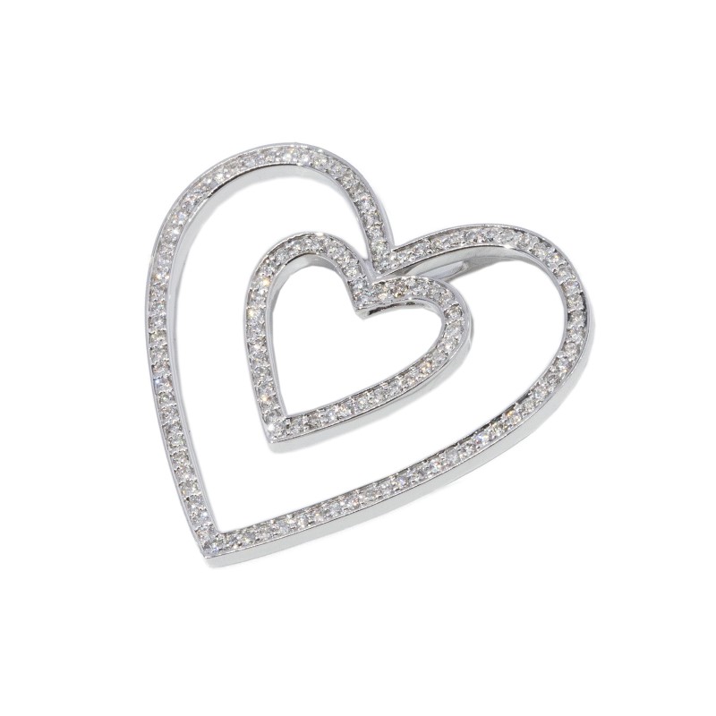 One cast polished 18 carat white gold diamond pendant with an open double-heart design measures approximately 29.00 mm in length by 28.00 mm in width and weighs a total of 5.20 grams. Stamped "750". In very good condition.