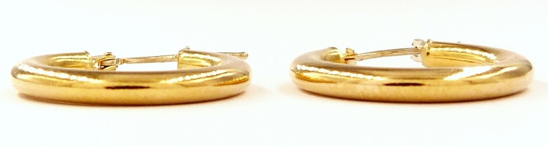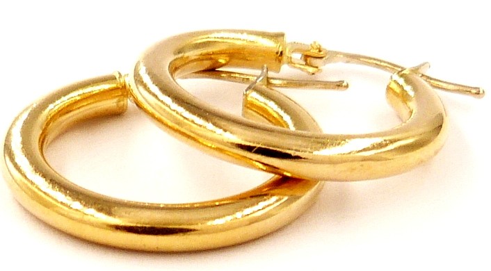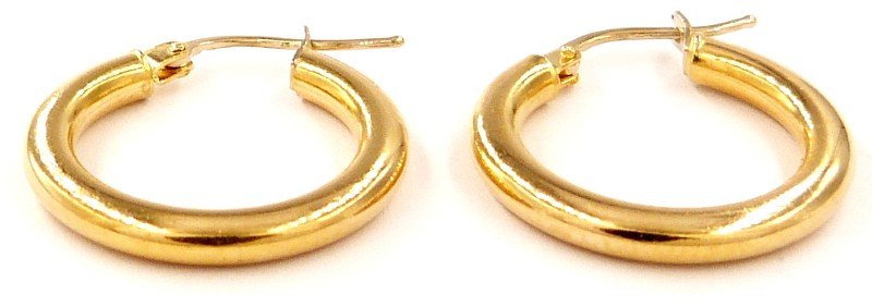 9ct yellow gold hoop earrings, weighing 2.42g. These classic pierced earrings feature a simple yet elegant hoop design, with a .375 hallmark indicating the 9 karat gold content. The smooth, rounded hoops create a timeless look that can be dressed up or down to suit any occasion.