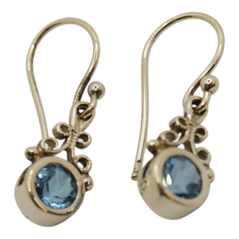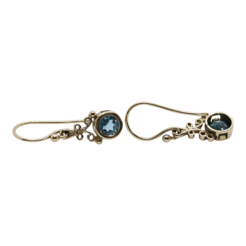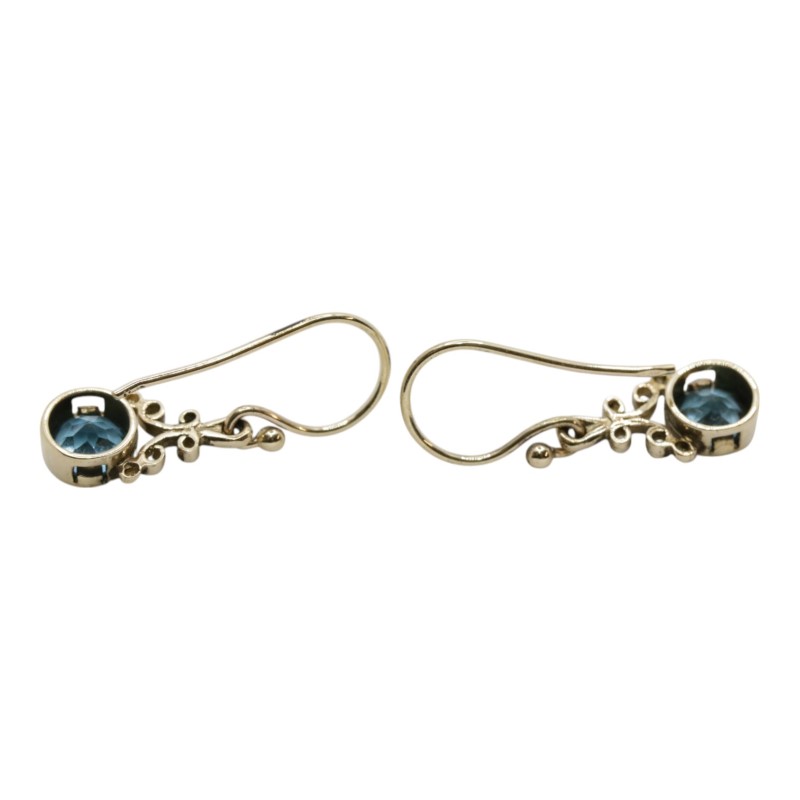 These 9 karat yellow gold drop earrings feature a pair of blue stones. Crafted from yellow gold with a .375 hallmark, the earrings have a total weight of 2.98 grams and are engraved with the 375 stamp, denoting their 9 karat purity. The simple yet elegant design showcases the vivid blue stones against the warm yellow gold backdrop. These pierced earrings would make a lovely addition to any jewellery collection. All sizes and measurements are approximate.