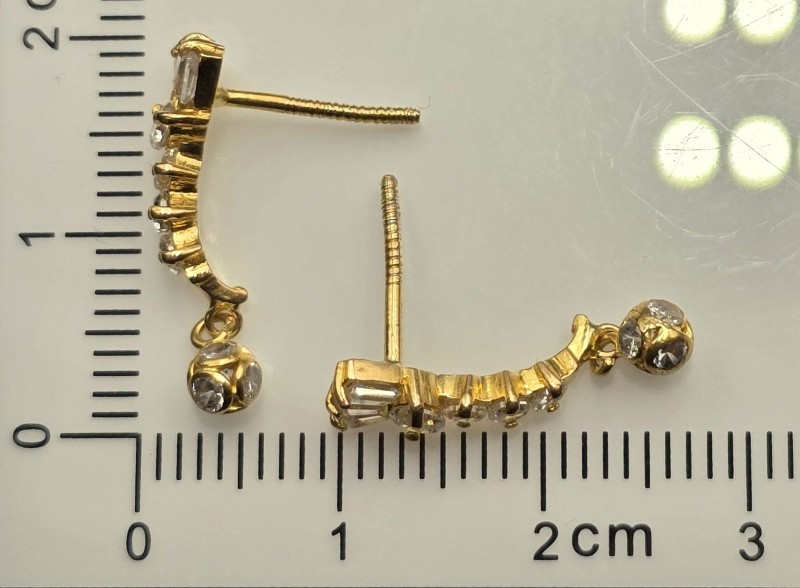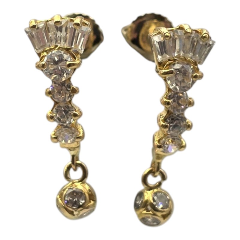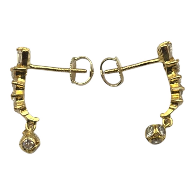 These striking 14K yellow gold drop earrings feature 26 CZ stones set in a bezel setting. The earrings have a hallmark of .585, indicating a 14 karat gold composition. With a total weight of 2.29 grams, these elegant drop-style earrings are a timeless accessory.