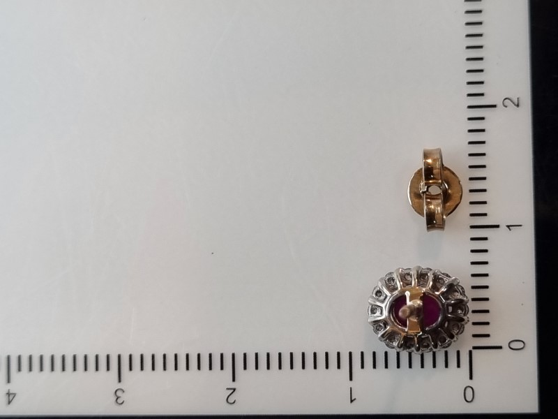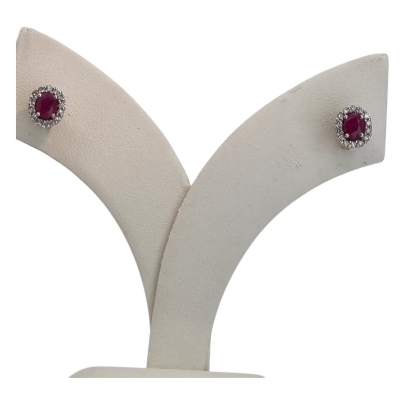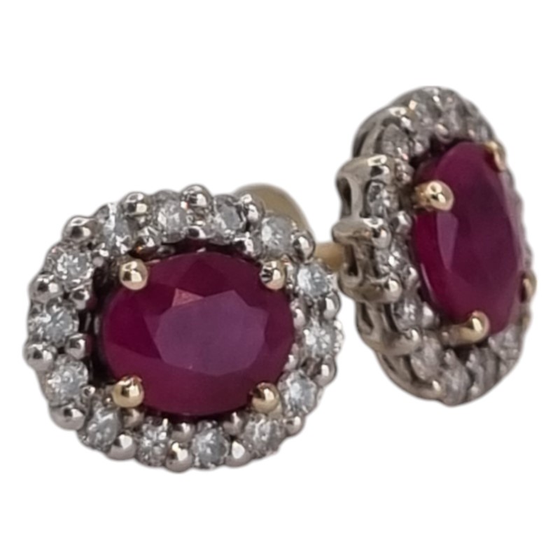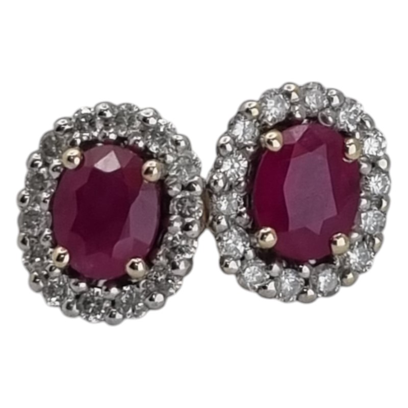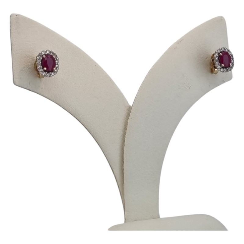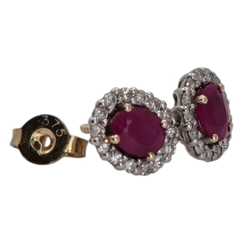 Elegant 9k yellow gold ruby and diamond stud earrings. The pair features a striking 0.45ct oval-cut ruby as the hero stone, set in a claw setting. Surrounding the ruby are 26 clear stones totaling 0.28ct in a complementary stud design. Engraved with the 375 hallmark, these earrings have a total weight of 1.51g. All sizes and measurements are approximate.