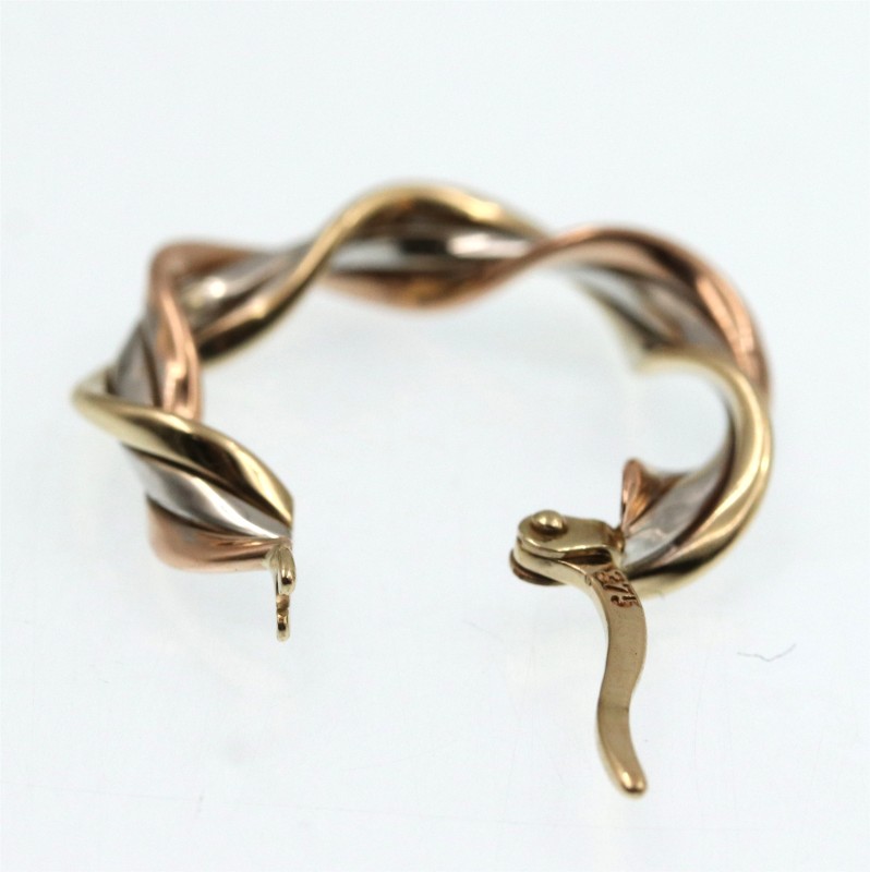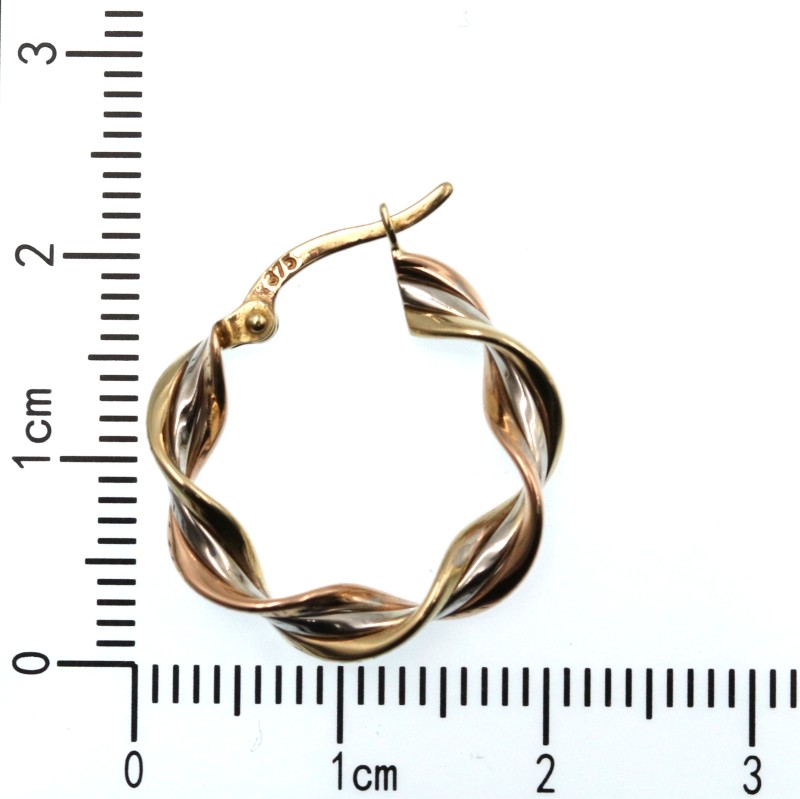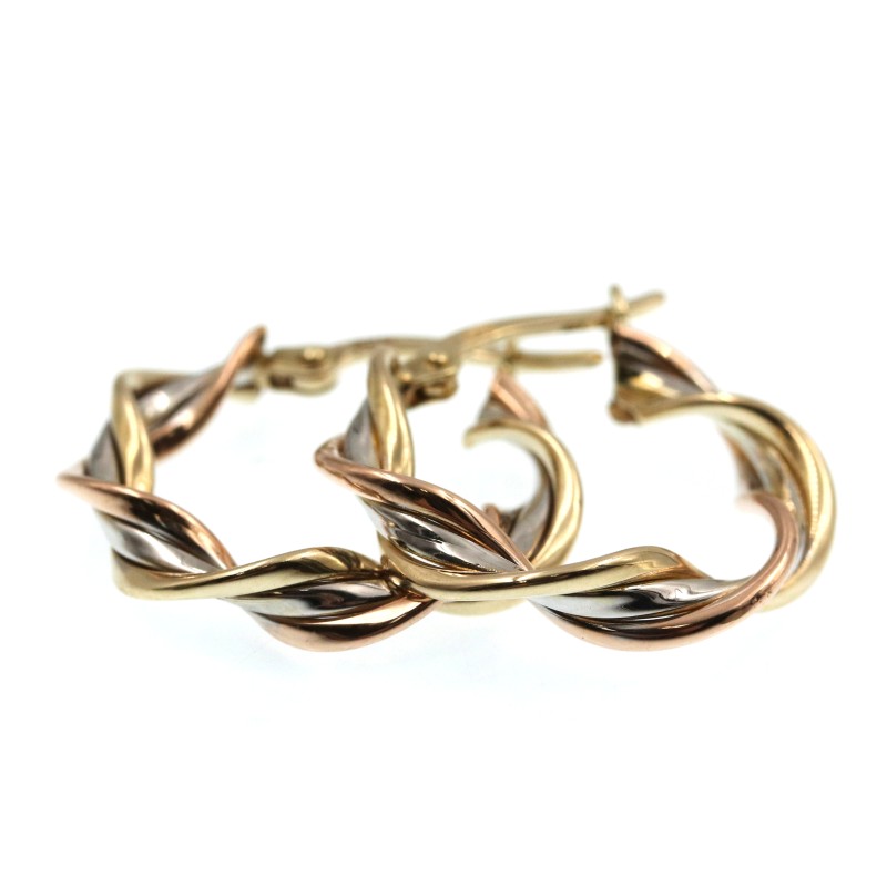 These 9ct multi-tone gold twist hoop earrings feature a sleek, versatile design. Hallmarked .375, they weigh a comfortable 2.02g, making them a lightweight and comfortable addition to your jewellery collection. The twist silhouette adds a modern touch, while the multi-tone finish provides a unique visual appeal. These pierced earrings are the perfect everyday accessory to elevate any outfit. All sizes and measurements are approximate.