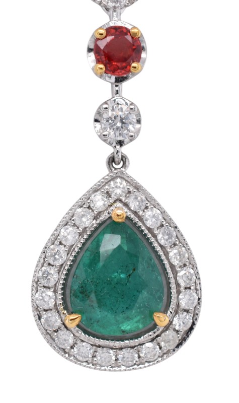 Exuding luxury and artistry, these platinum earrings feature a round cluster of seven brilliant-cut diamonds, leading to an articulated drop showcasing a vivid sapphire in a yellow gold four-claw setting. Beneath, a single round brilliant diamond complements a striking pear-shaped emerald, beautifully framed by 21 sparkling diamonds. A captivating blend of colour, movement and brilliance - designed to dazzle from every angle.