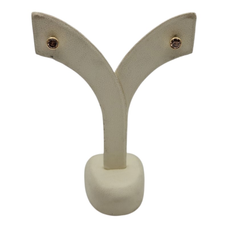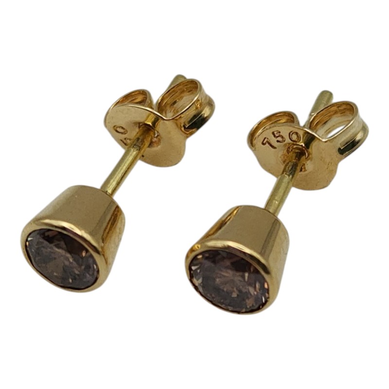 Elegant 18K yellow gold earrings with a classic stud design. The earrings feature a bezel setting showcasing two round brown diamonds with a total diamond weight of 0.68 carats. Crafted from 18K yellow gold with a hallmark of .750, these earrings weigh approximately 1.28 grams. All sizes and measurements are approximate.
