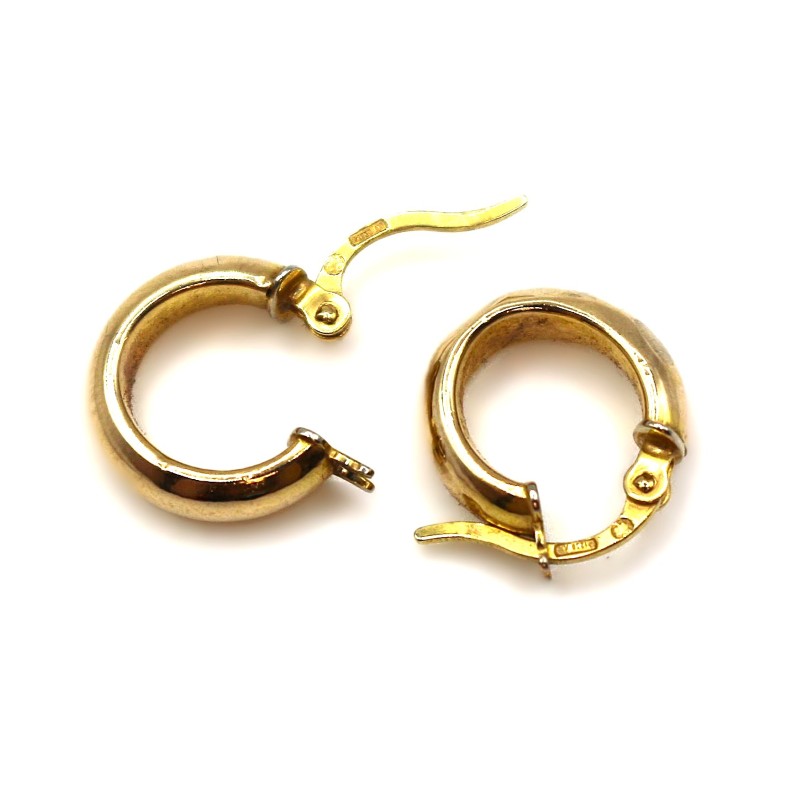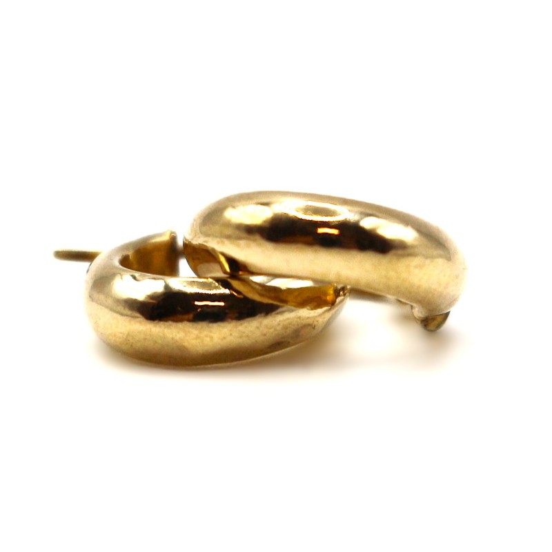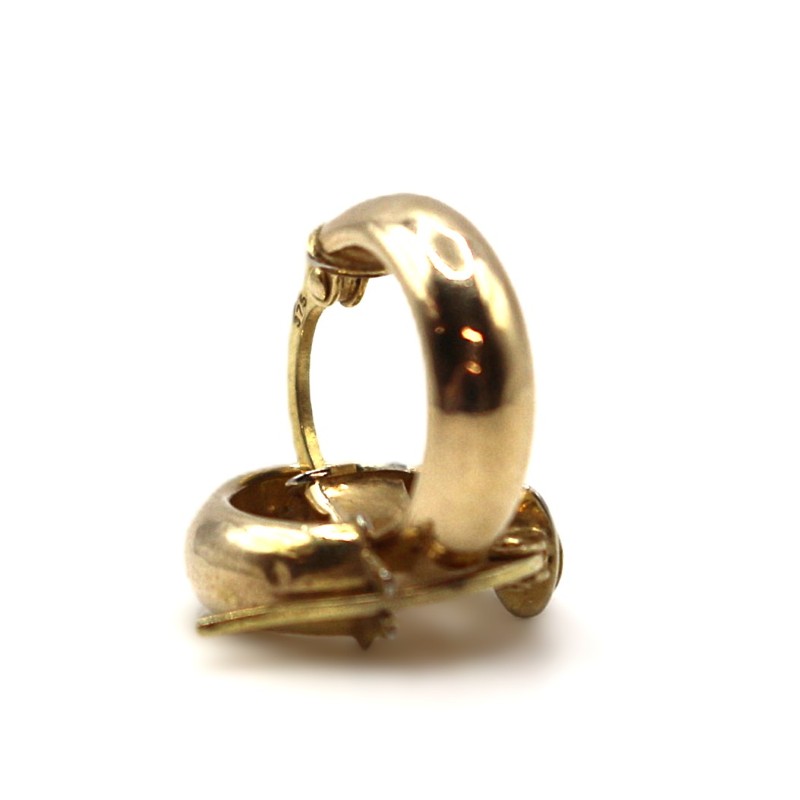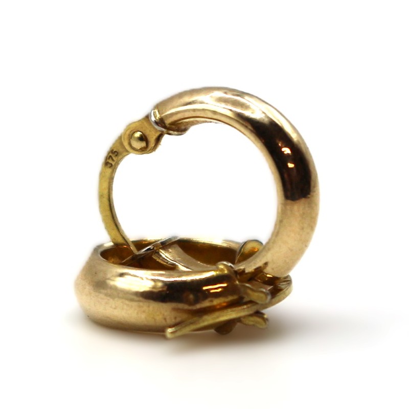These classic 9 Karat yellow gold hoop earrings feature a sleeper design, perfect for everyday wear. Weighing a delicate 0.86 grams, the earrings are stamped with a .375 hallmark indicating their 9 Karat gold composition. With a simple yet sophisticated shape, these pierced earrings are a timeless accessory suitable for any occasion. All sizes and measurements are approximate.