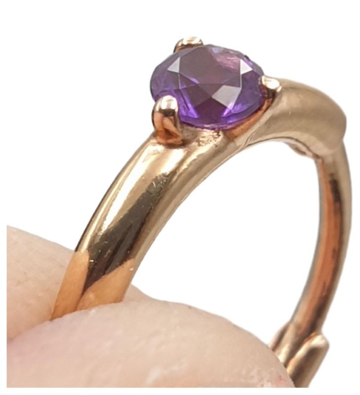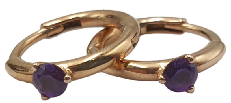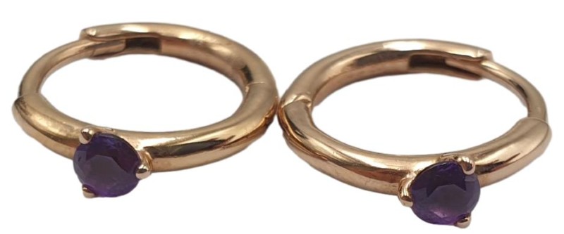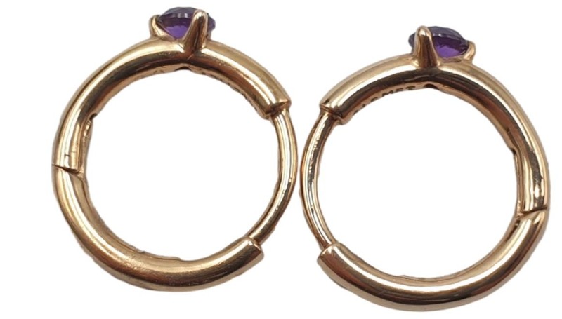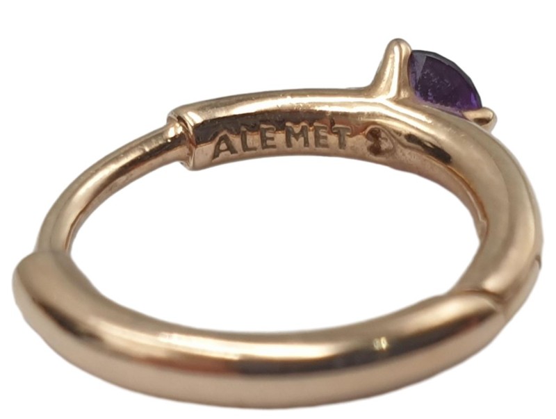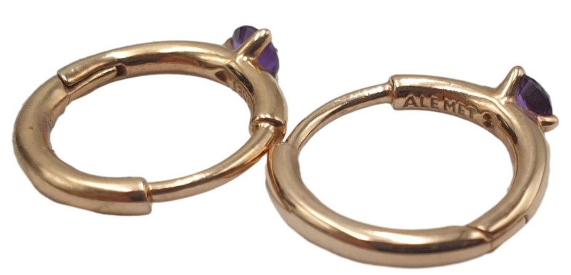 These 9 Karat rose gold-plated silver sleeper earrings from Pandora feature a hoop shape with a claw stone setting. The earrings are engraved with the letters "ALE MET" and have a 925 hallmark. Each earring contains two 0.05 carat purple stones for a total diamond weight of 0.10 carats. The earrings weigh 1.22 grams.