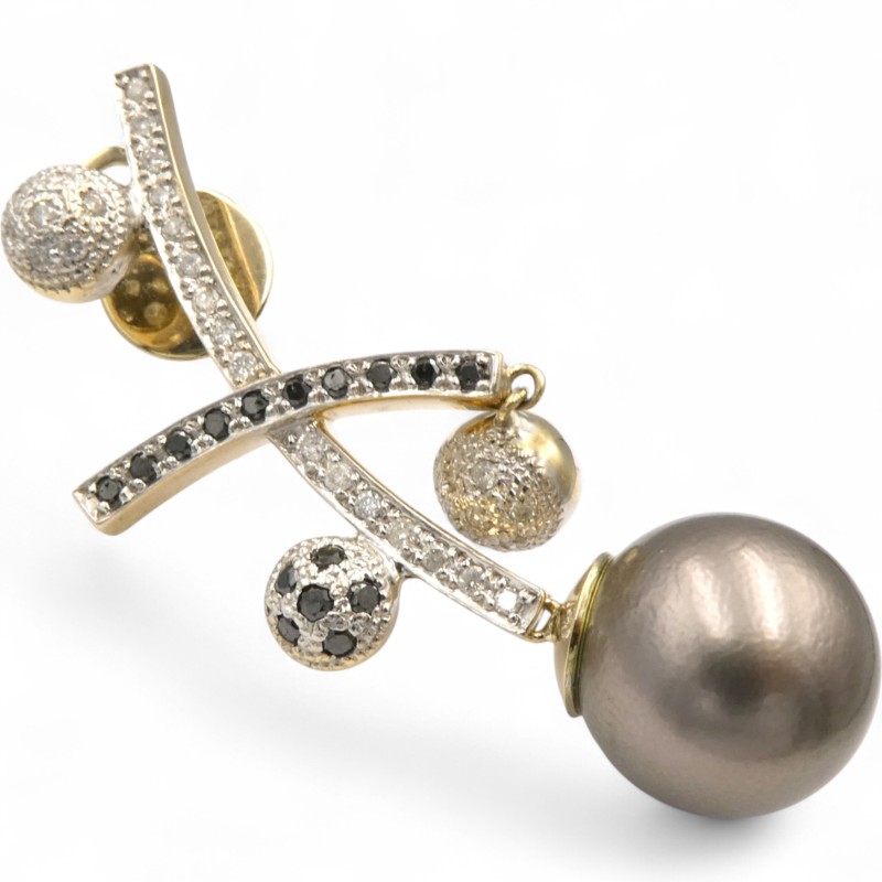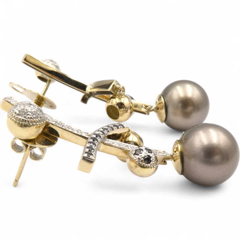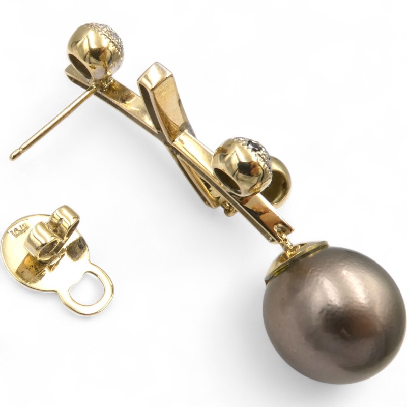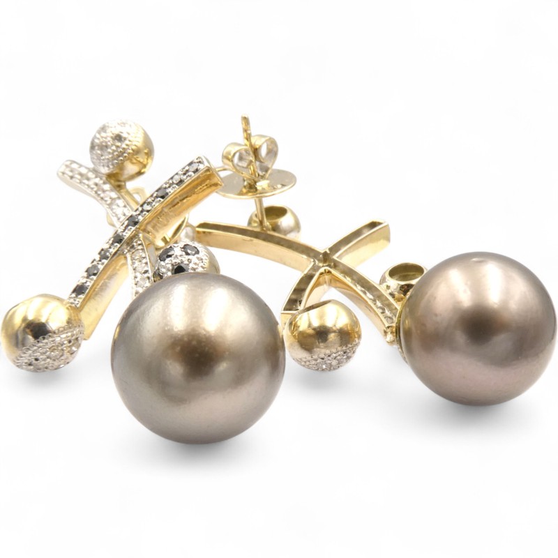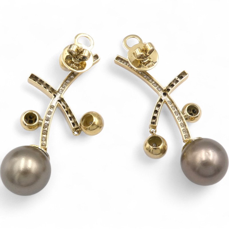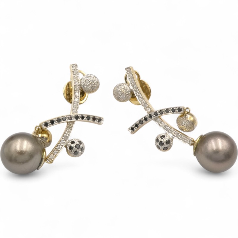 Elegant 14K yellow gold earrings with a unique tension-set design. Featuring 2 pearls and 92 sparkling diamonds totaling 1.26 carats. The bold yet minimalist style is crafted from 20.73g of premium yellow gold. These pierced earrings make a stunning statement piece. All sizes and measurements are approximate.