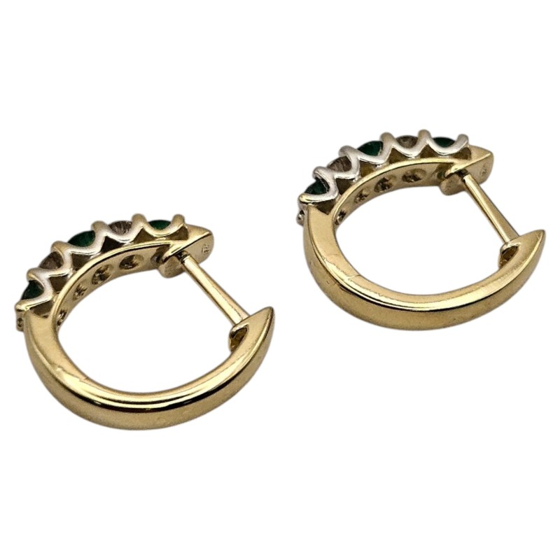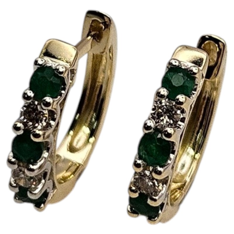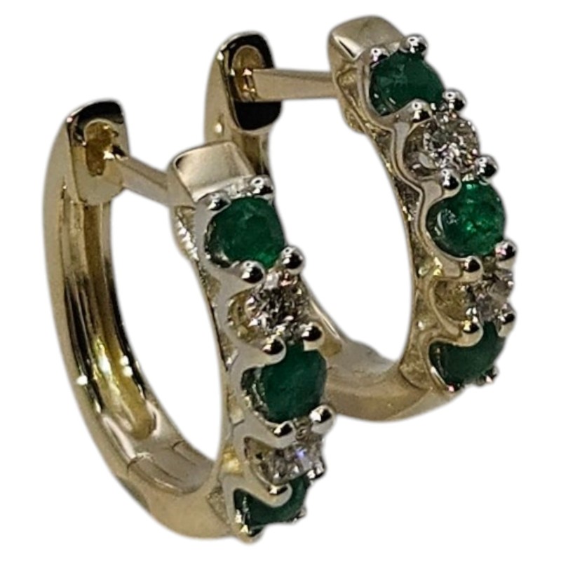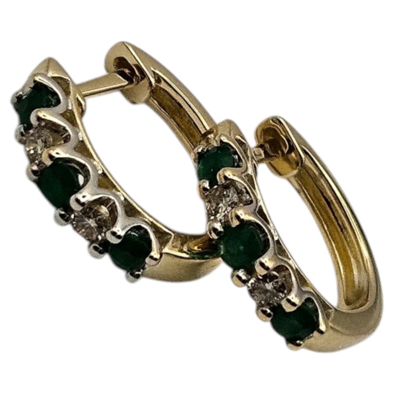 Elegant 9 karat yellow gold hoop earrings adorned with natural emeralds and diamonds. The precious stones are secured in claw settings, creating a stunning visual effect. These pierced earrings measure 1.4cm in diameter and weigh a total of 2.48 grams, including 0.14 carats of diamonds. A timeless and versatile accessory suitable for any occasion. All sizes and measurements are approximate.
