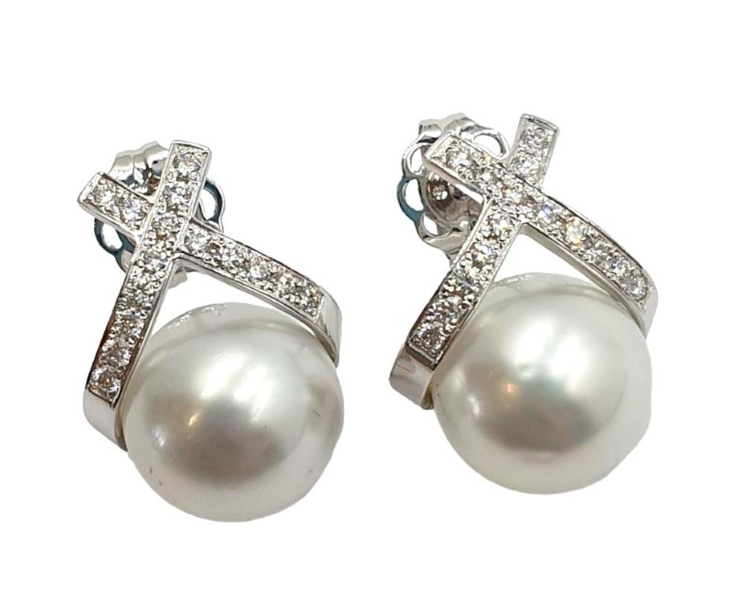 Elegant 18ct white gold earrings with a striking pearl and sparkling diamond accents. Crafted from 6.52g of precious white gold and hallmarked .750, these drop/dangling earrings feature 2 lustrous pearls and 30 diamond stones totalling 0.30ct. Designed for pierced ears, this timeless jewellery piece will complement any outfit.