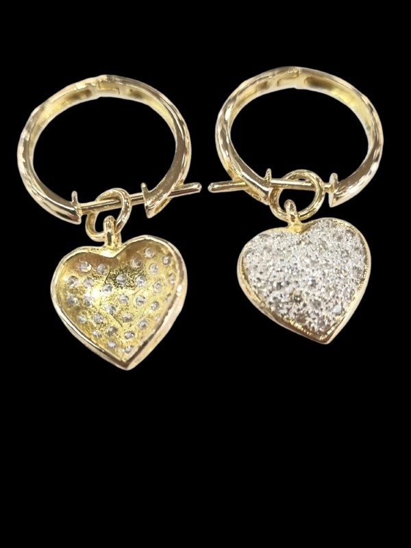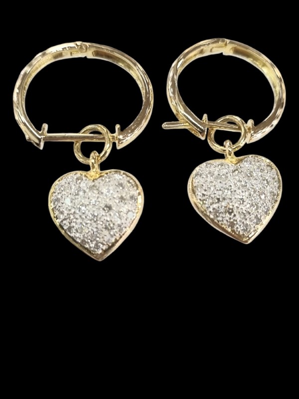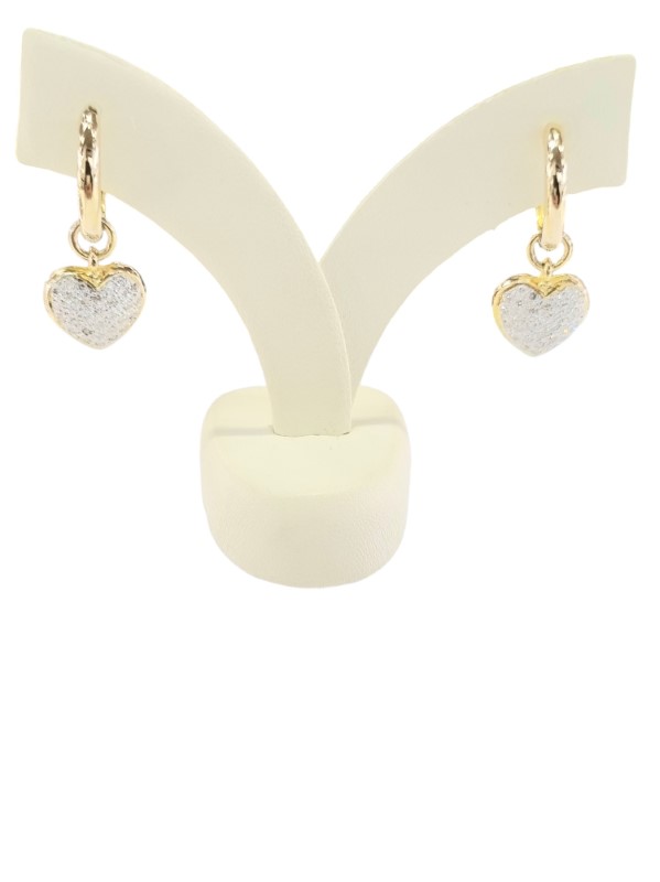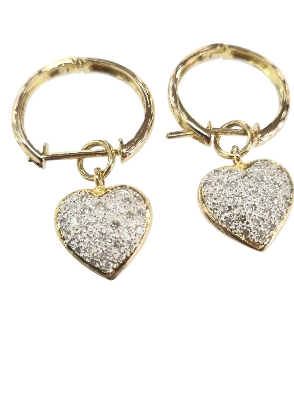 Crafted in 18K yellow gold, these pave heart sleeper earrings feature a dazzling array of 0.64 carats of diamonds set in a chic hoop silhouette. The pave stone setting creates a shimmering effect, adding a touch of elegance to this versatile pierced earring design. Hallmarked for quality assurance, these earrings weigh a comfortable 5.87 grams. All sizes and measurements are approximate.