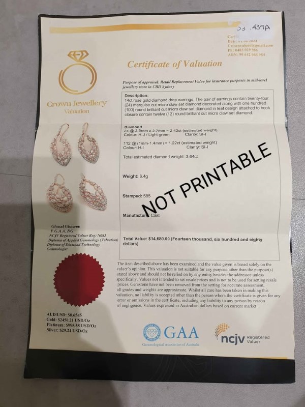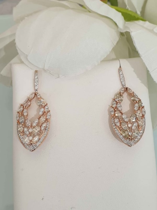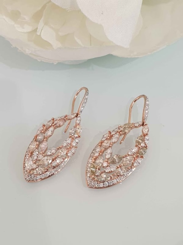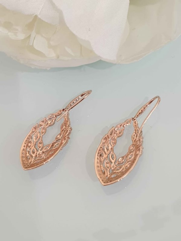 Elegant 14K rose gold drop earrings featuring a stunning array of sparkling diamonds. The earrings are crafted from high-quality rose gold with a hallmark of .585, ensuring exceptional purity and durability. The main attraction is the 24 round brilliant-cut diamonds totaling 0.1 carats, complemented by an additional 112 small accent diamonds weighing a total of 3.64 carats. This captivating combination creates a dazzling, eye-catching display. With a total weight of 6.4 grams, these earrings offer a substantial yet comfortable wear. All sizes and measurements are approximate.