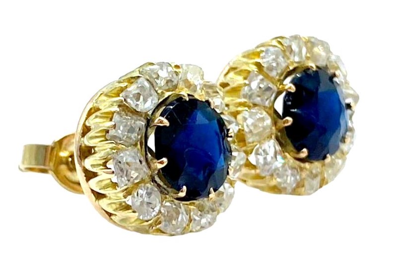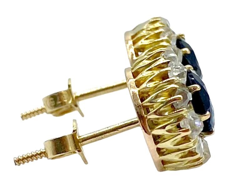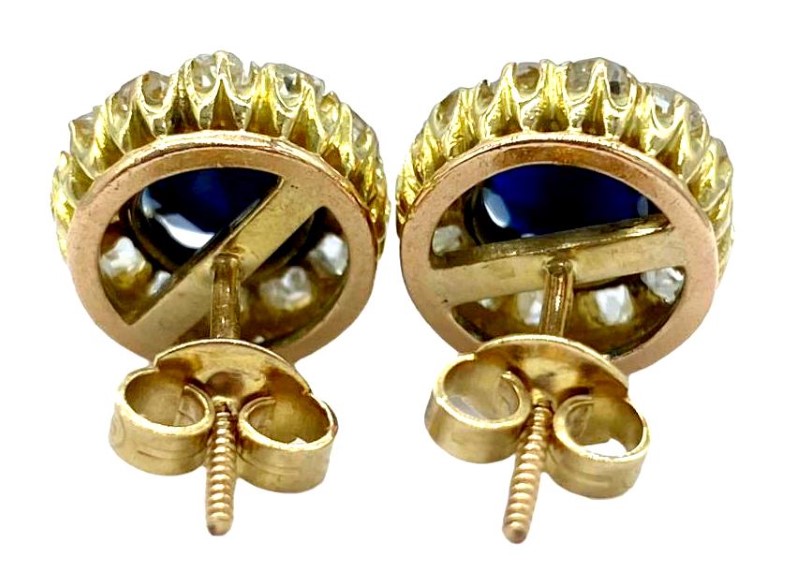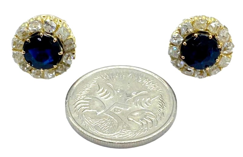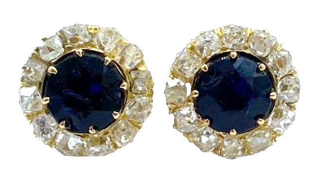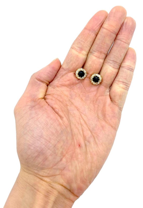 Illuminate your style with these 9ct yellow gold stud earrings each featuring blackish-blue paste stones (rhinestones) surrounded by a halo of 2.40cts total weight of old cut diamonds.