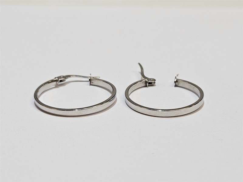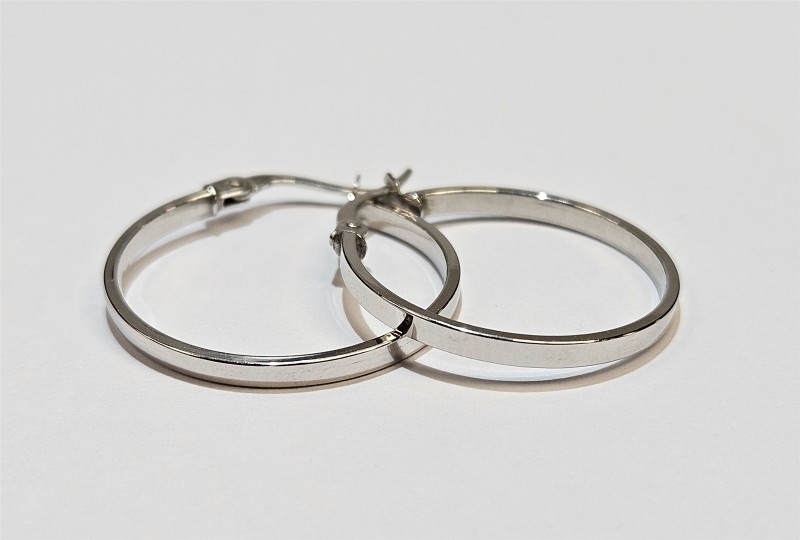 These stylish 9 Karat White Gold hoop earrings feature a classic pierced design. Crafted with a .375 hallmark, the earrings measure 2.5cm wide and weigh a comfortable 0.9 grams. The simple and elegant hoop shape makes this a versatile accessory that will complement any outfit. All sizes and measurements are approximate.