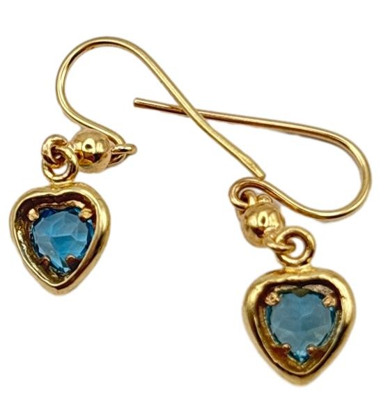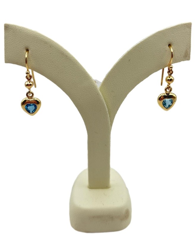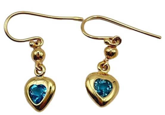Elegant 9k yellow gold earrings, weighing 2.28g, with a charming heart shape. These versatile earrings feature blue stones that add a touch of colour to the warm golden hue. Suitable for pierced ears, these heart-shaped drop earrings are a classic accessory for any occasion.