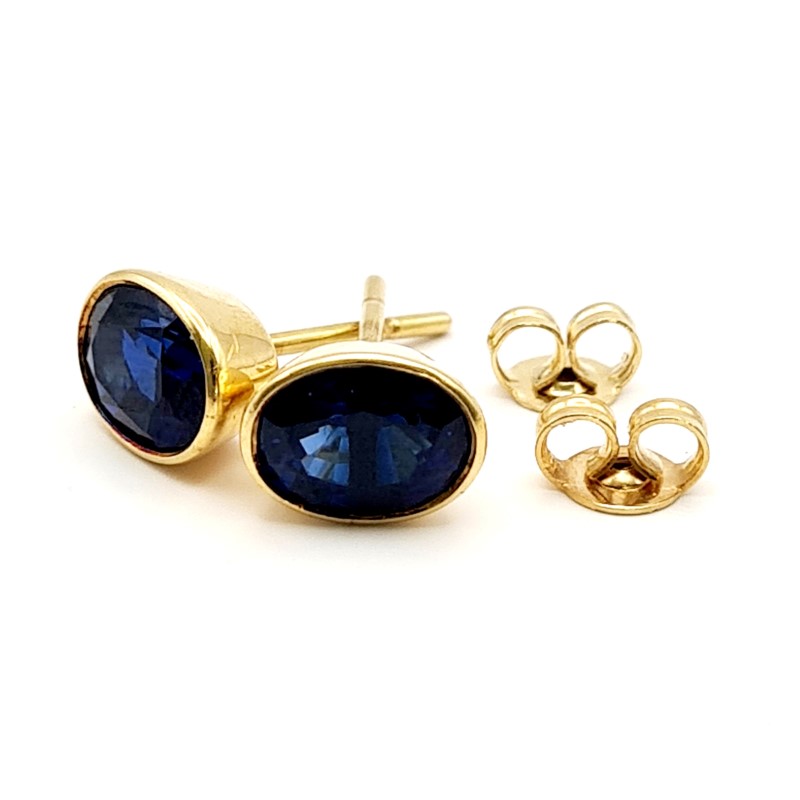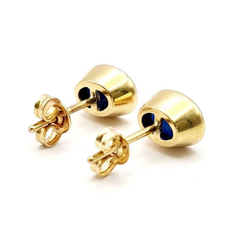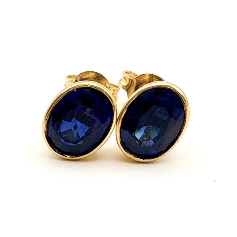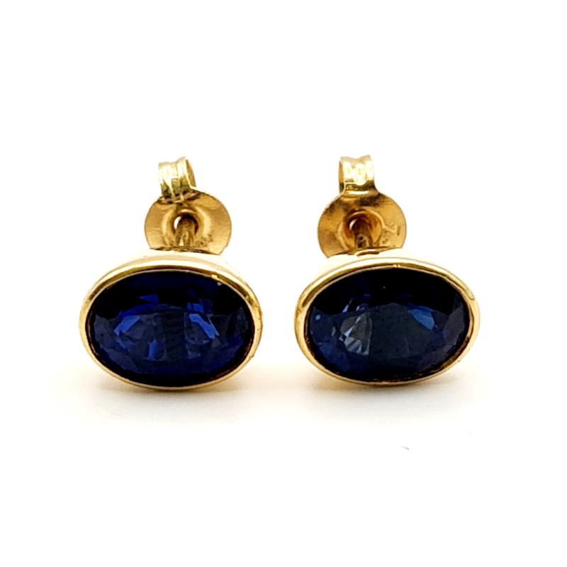 18CT YELLOW GOLD 2 STONE SYNTHETIC SAPPHIRE STUD EARRINGS. EACH EARRING CONTAINS AN OVAL SYNTHETIC SAPPHIRE RUB OVER SET WITH POST & BUTTERFLY FITTINGS.