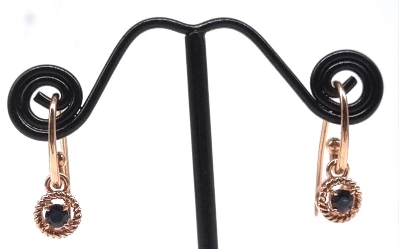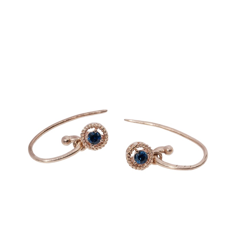 One pair of cast polished 9 carat rose gold sapphire dangle earrings each consists of a twisted wire with a