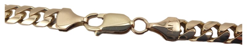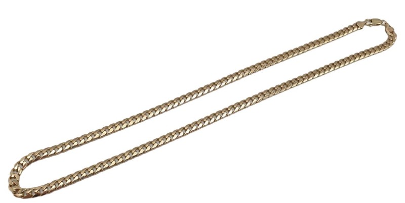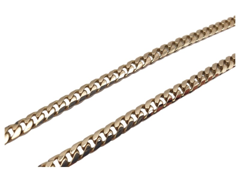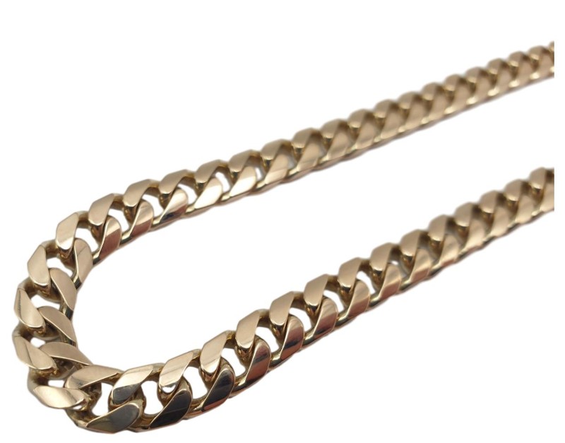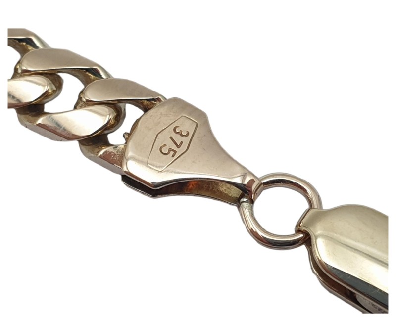 This elegant 9 Karat yellow gold chain features a classic curb link design, crafted with precision in Italy. The 40.93-gram piece is marked with the hallmark .375, ensuring its quality. With a width of 0.6cm, this versatile unisex chain can be dressed up or down to suit any occasion. The engraved details "375 ITALY P*" add a subtle touch of personalization. All sizes and measurements are approximate.