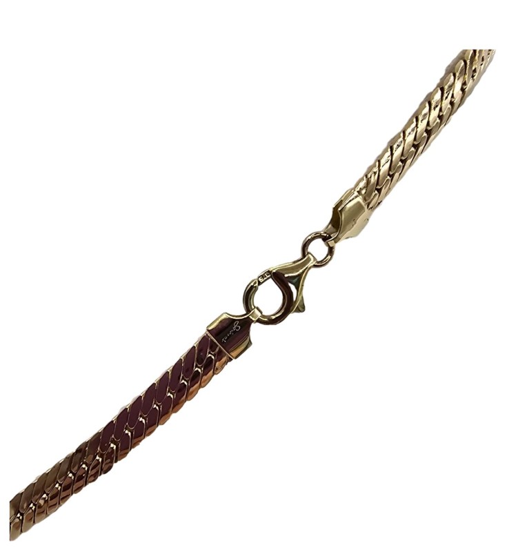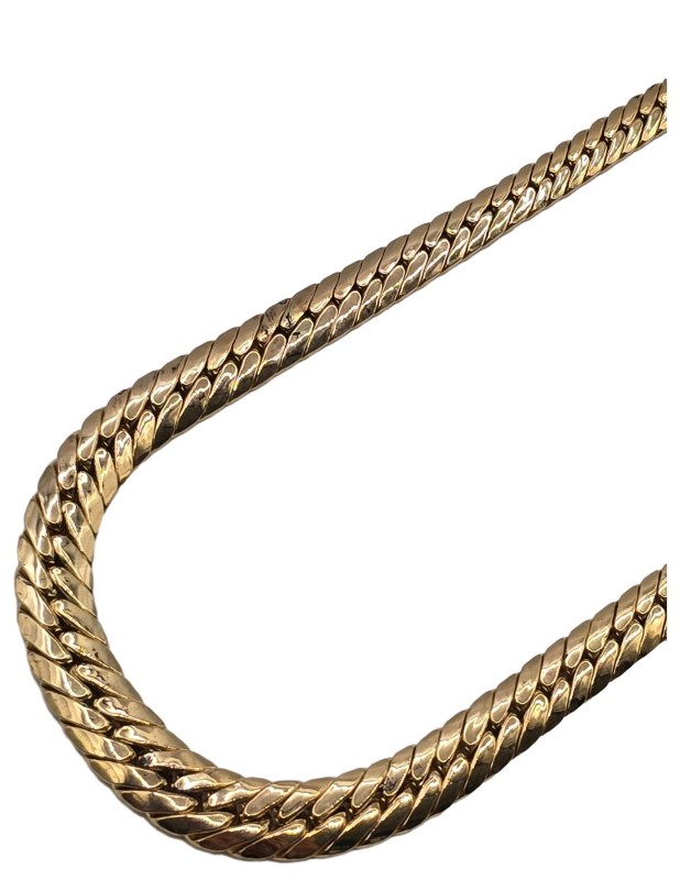 This 9 Karat yellow gold chain features a delicate, classic design. Crafted from high-quality materials, the chain measures 43cm in length and weighs a substantial 15.08 grams. The uniform 0.8cm width creates a streamlined, refined appearance suitable for everyday wear or special occasions. Adorned with a hallmark of .375, this piece is a testament to its superior craftsmanship and authenticity. All sizes and measurements are approximate.
