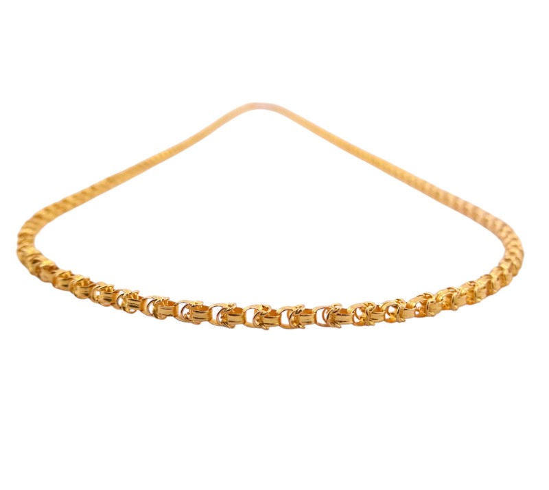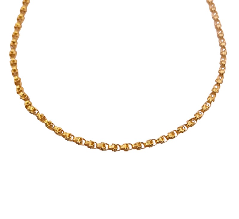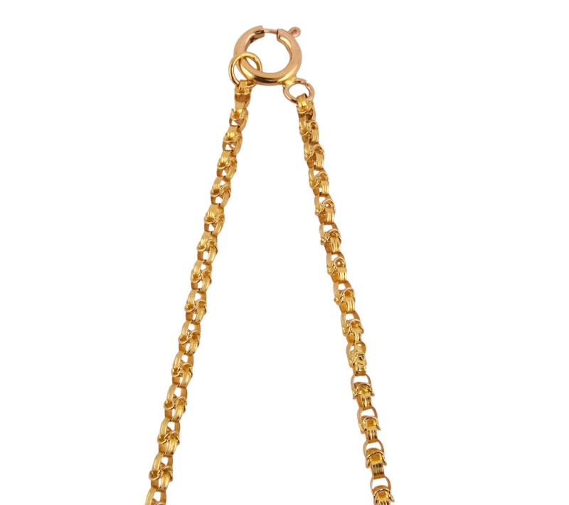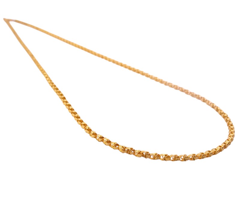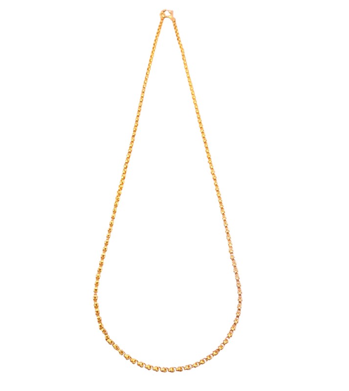 This stunning 18K yellow gold chain features a unique belcher link design. Crafted from high-quality yellow gold with a hallmark of .750, this ladies' chain is both durable and fashionable. The pattern links create a beautiful, textured appearance that will complement a variety of pendant styles or be worn on its own. Weighing a substantial 6.5 grams, this chain is a stunning and versatile accessory.