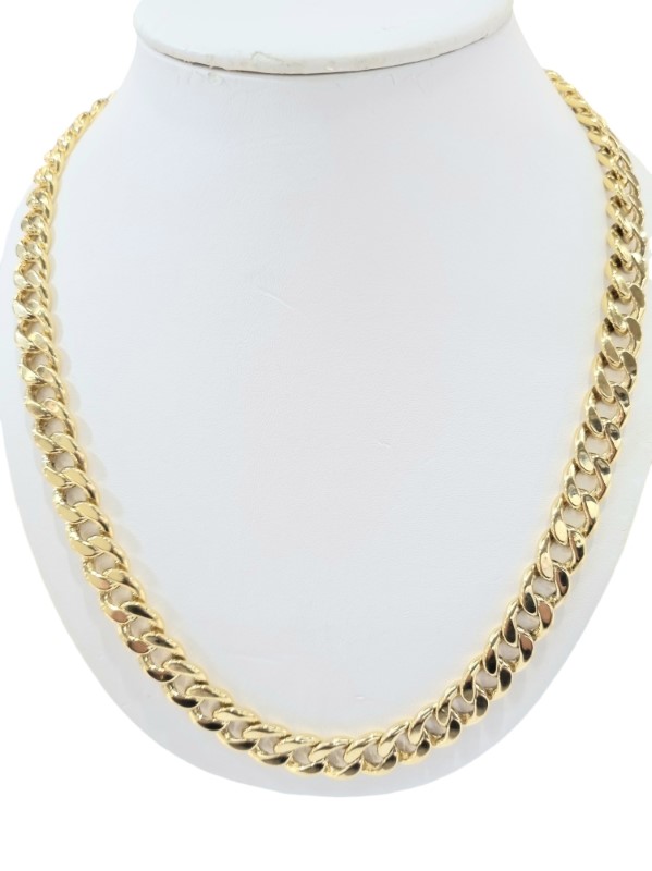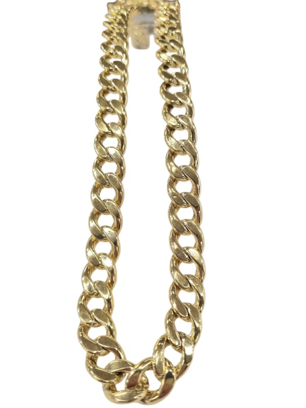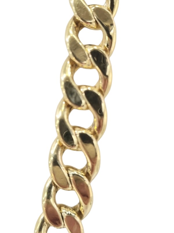 This 9 karat yellow gold curb link chain is a classic men's accessory. Crafted from durable yellow gold, the chain measures 60cm in length and weighs a substantial 118.56 grams. The 1cm wide links create a bold, eye-catching design. All sizes and measurements are approximate.