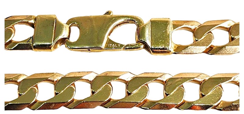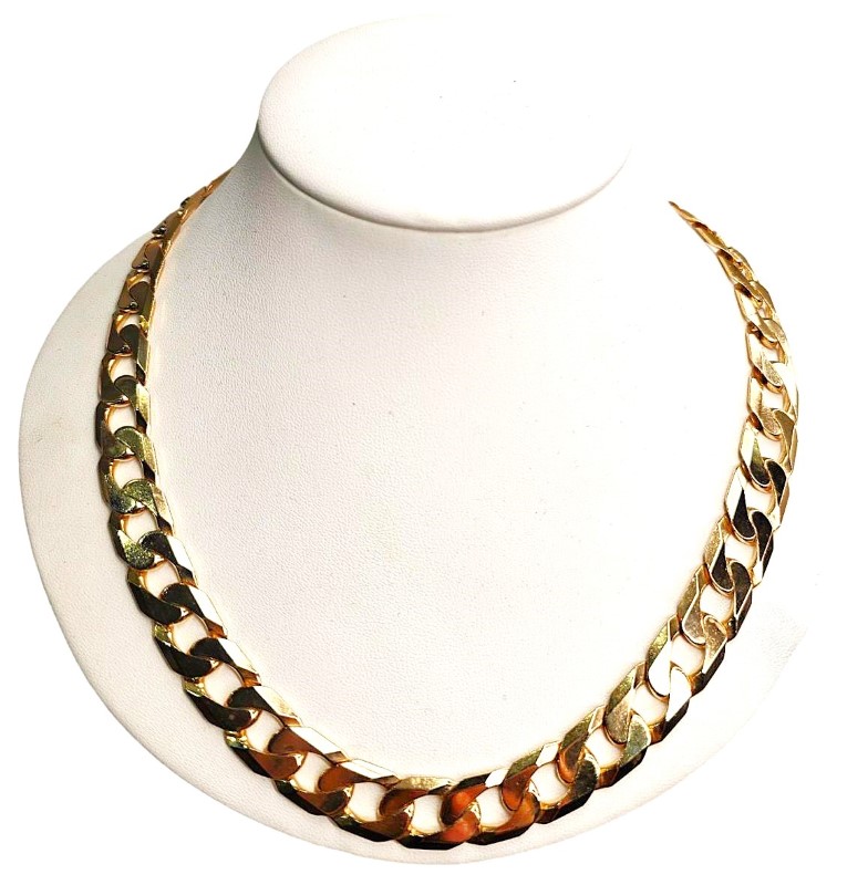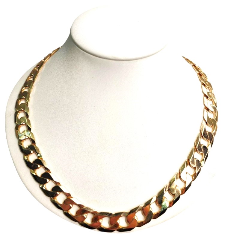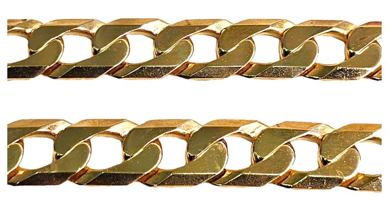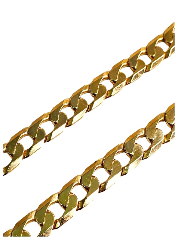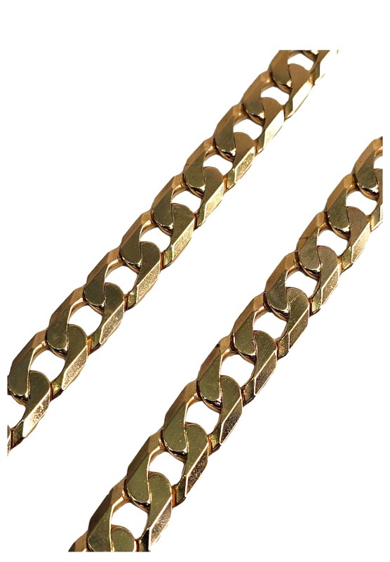 This 9 karat yellow gold chain necklace features a classic design in a vibrant yellow hue. Crafted from 9 karat yellow gold, the necklace measures 57cm in length and weighs a substantial 108.62 grams. With a width of 1.2cm, this ladies' chain necklace offers a stylish and versatile look that can be dressed up or down. All sizes and measurements are approximate.