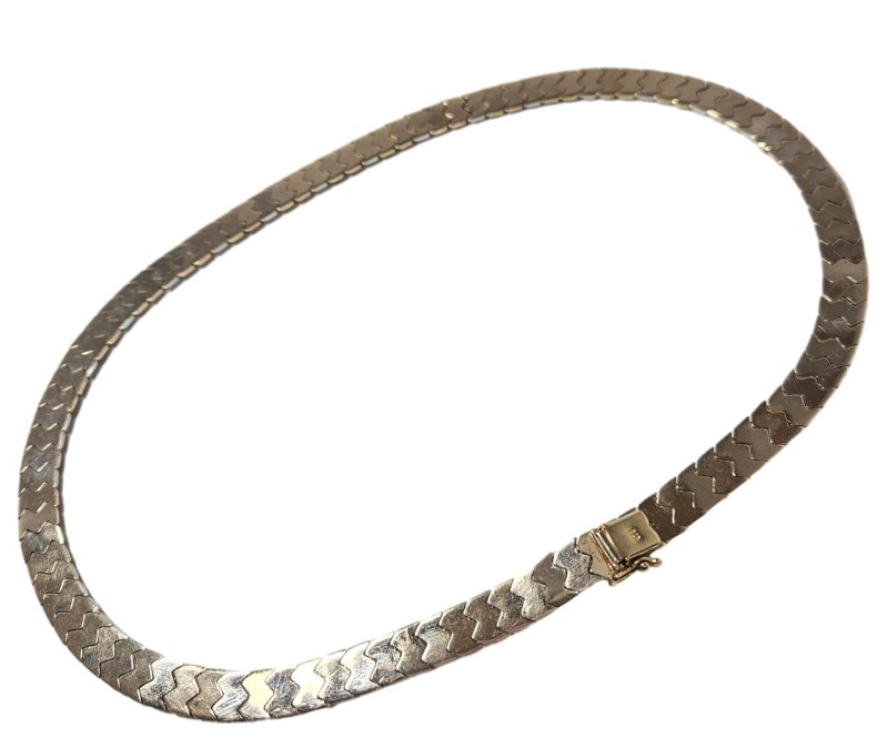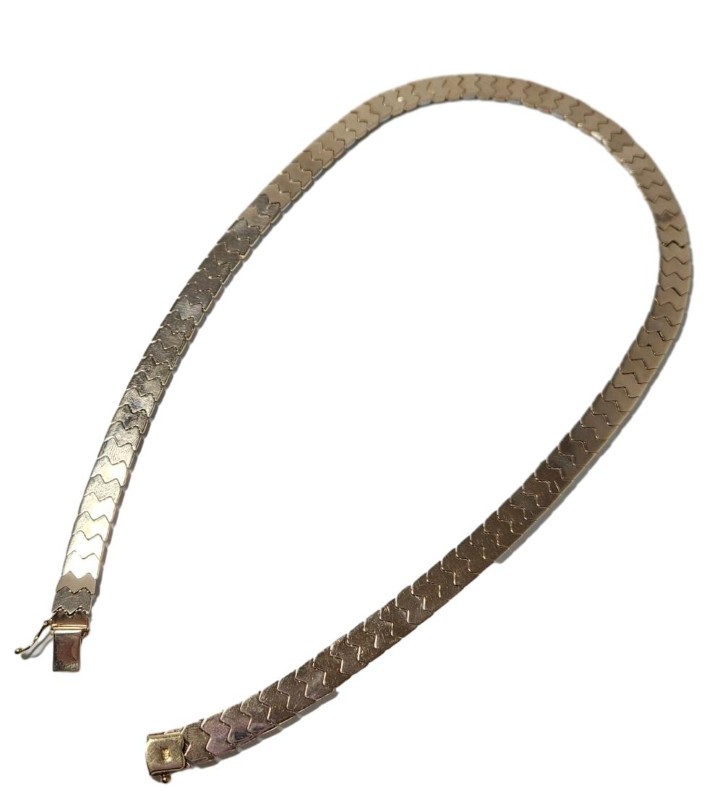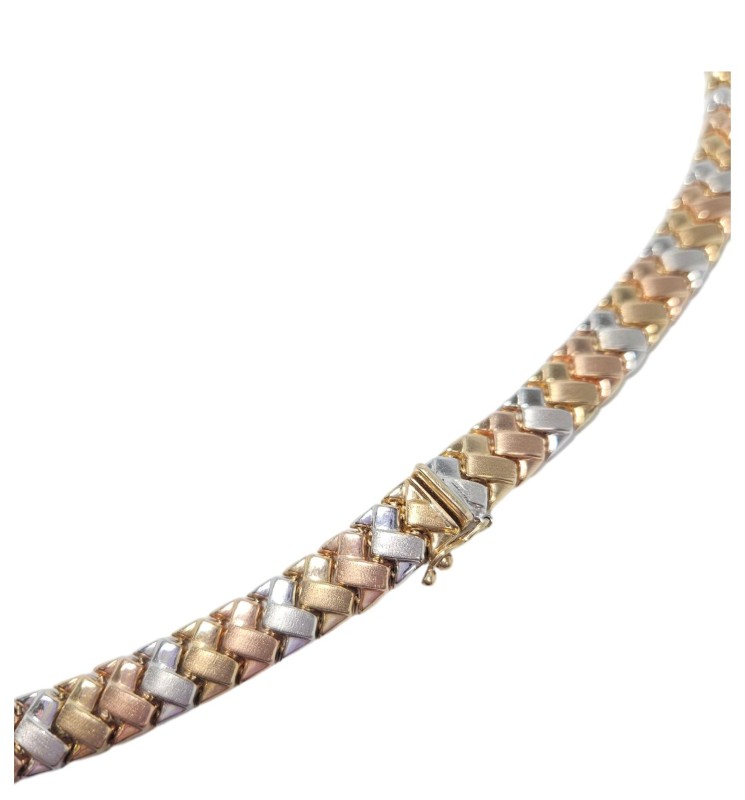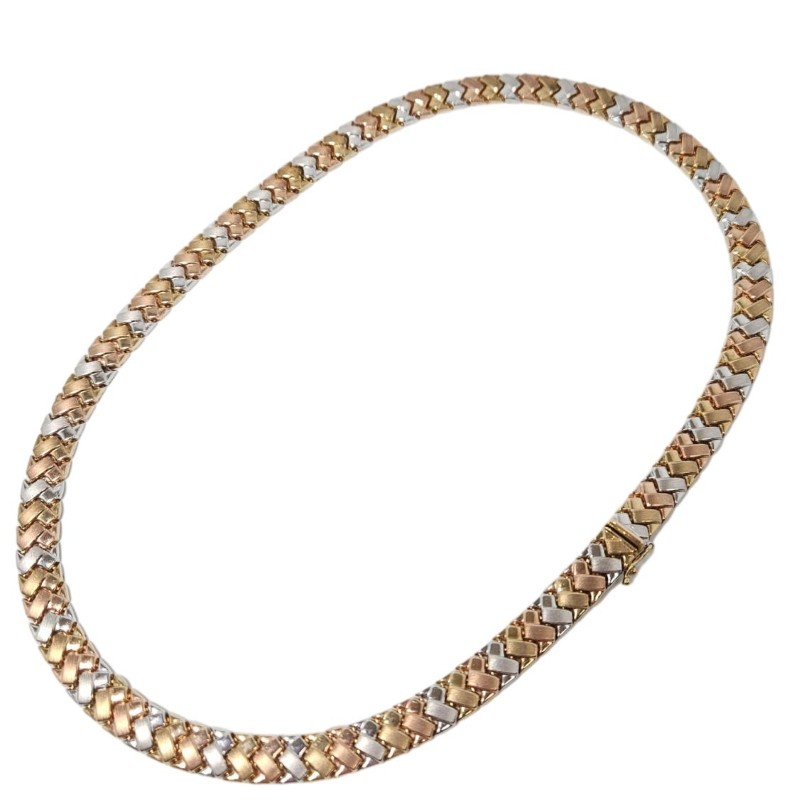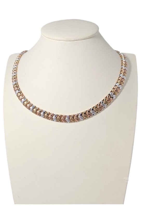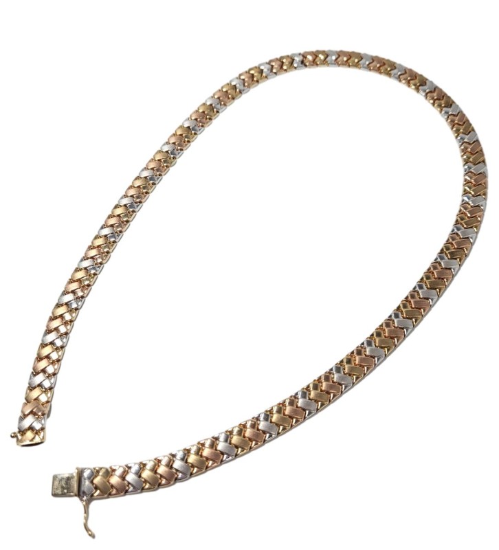 This stunning 9 Karat multi-tone gold chain features a sleek flat link design. Measuring 46 cm in length and weighing 21.69 grams, this chain showcases a captivating 3-tone finish that adds depth and visual interest. Crafted with care, the flat link shape creates a contemporary and versatile look suitable for any occasion. All sizes and measurements are approximate.
