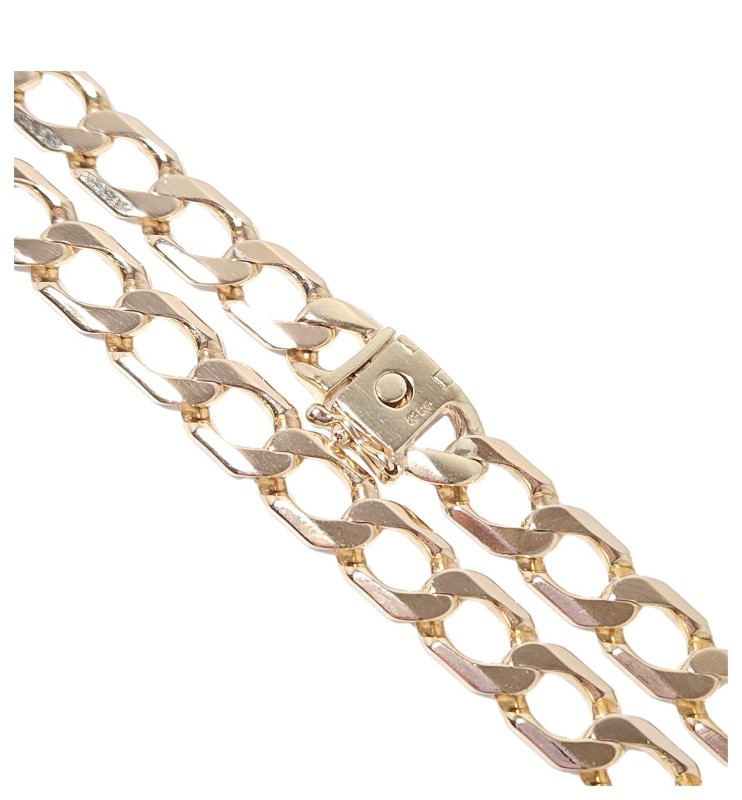 This elegant 9k yellow gold curb chain is a timeless classic. The hallmarked .375 curb link design has a fancy style, weighing a substantial 43.73g. With its warm yellow hue, this versatile ladies chain can be dressed up or down to complement any look. All sizes and measurements are approximate.