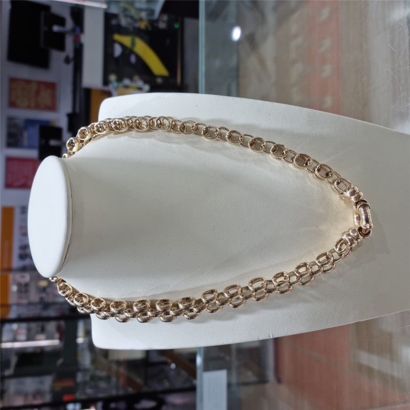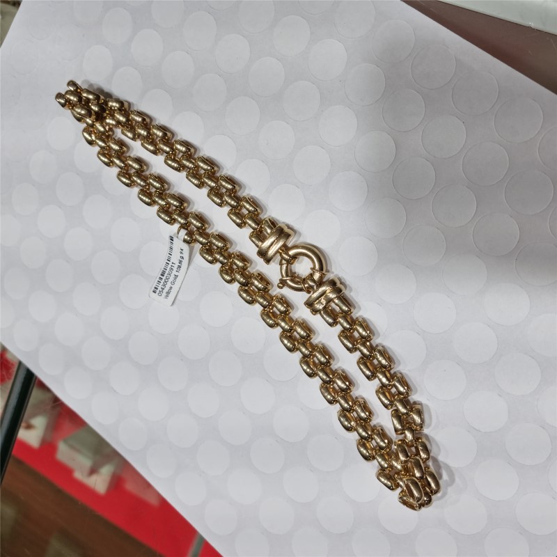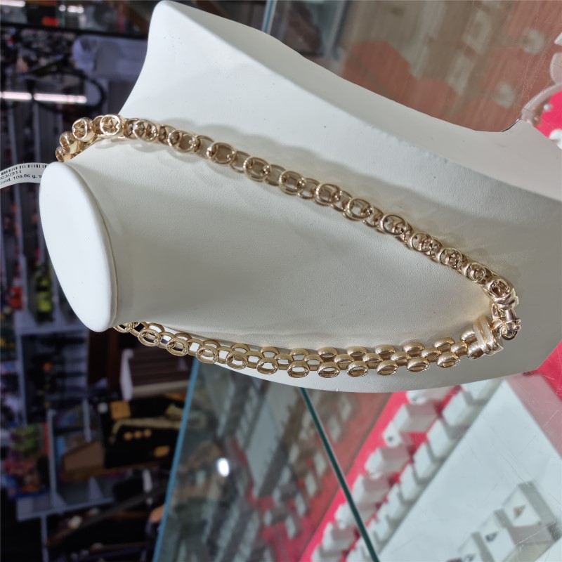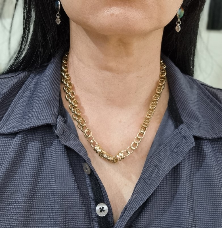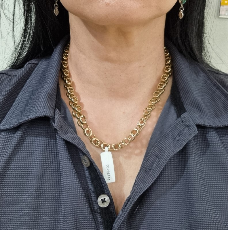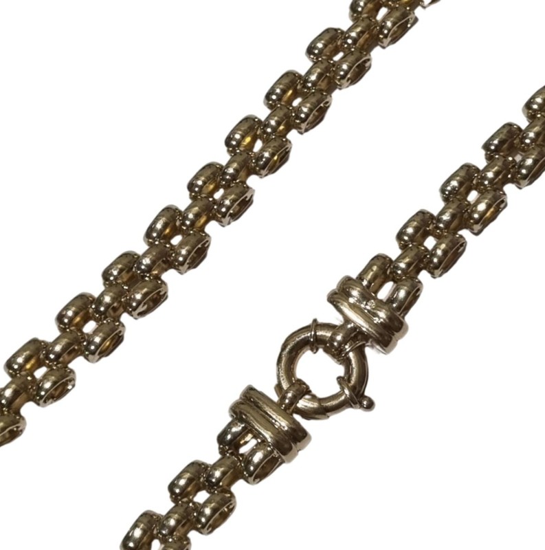 This 9 karat yellow gold chain is an elegant and classic accessory. Crafted from durable yellow gold material, the chain features a timeless link shape with a length of approximately 45cm. Weighing 108.86 grams, this ladies chain is approximately 1cm wide and Thickness 7mm, making it a versatile piece that can be worn for both casual and formal occasions. All sizes and measurements are approximate.